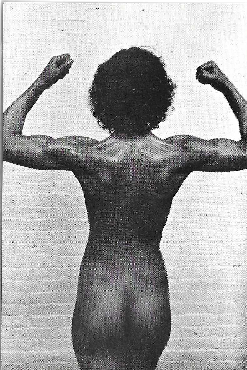 postcard with photograph image from the back of naked woman flexing her musclesArtwork Details