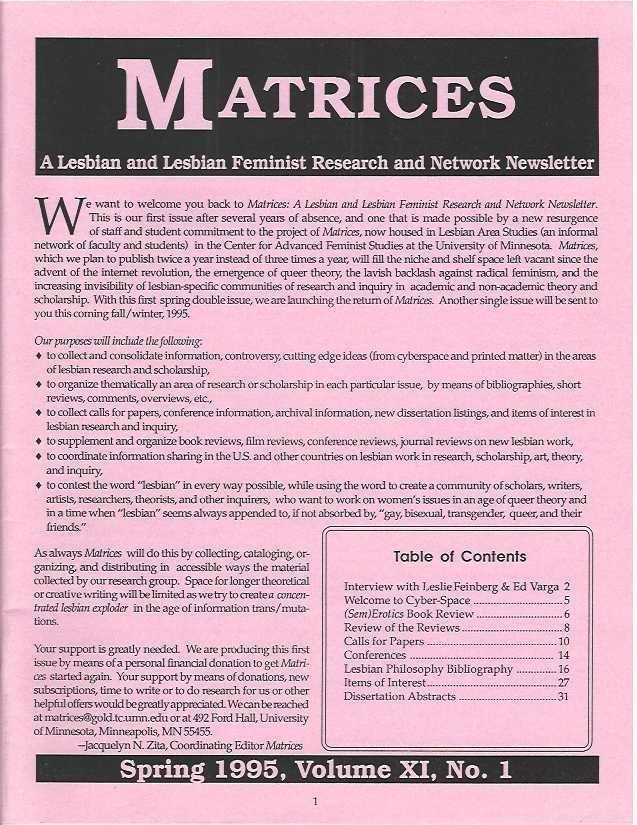 Lesbian Radical Feminist Newsletter. Contains interviews (Leslie Feinberg, Ed Varga, Jacquelyn Zita, Claudia Card), Book Reviews, Essays, Bibliographies,, Cyberspace resources, Dissertation Abstracts. Connected to the University of Minnesota Center for Advanced Feminist Studies.