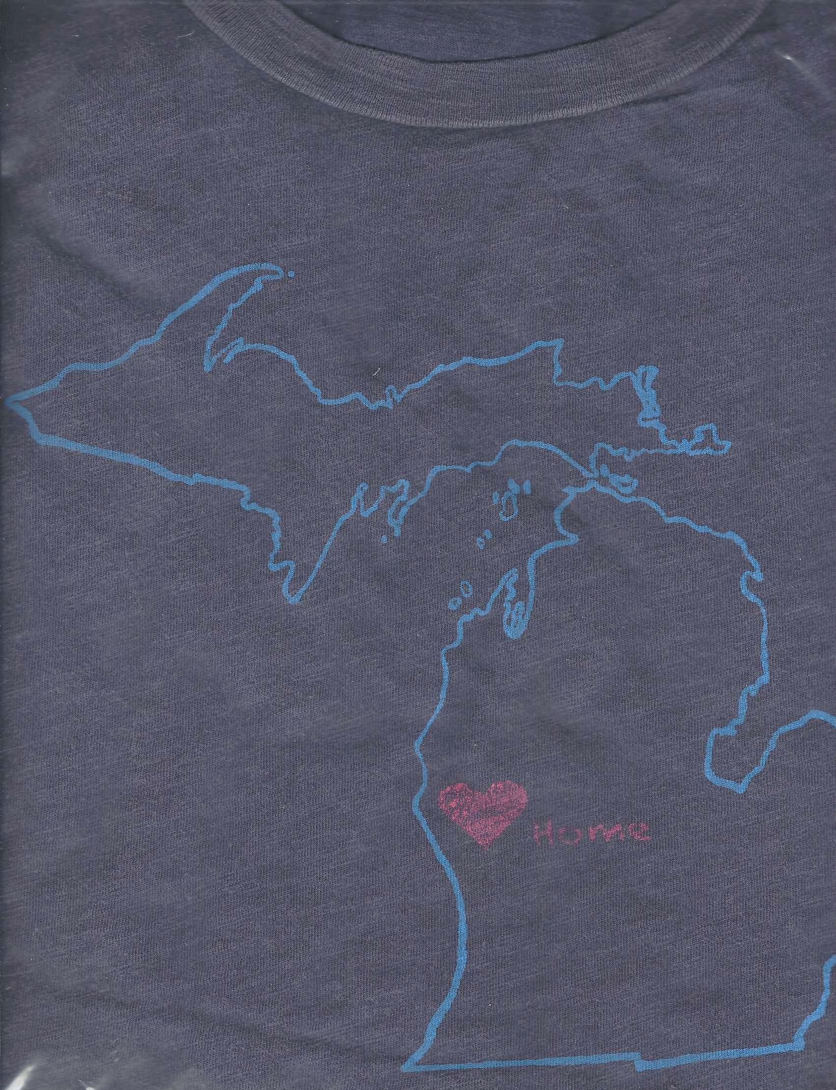 Heart with text reading "home" in geographic location of Hart, Michigan (location of festival) with outline of the state of Michigan.Clothing/Dress/Costume Details