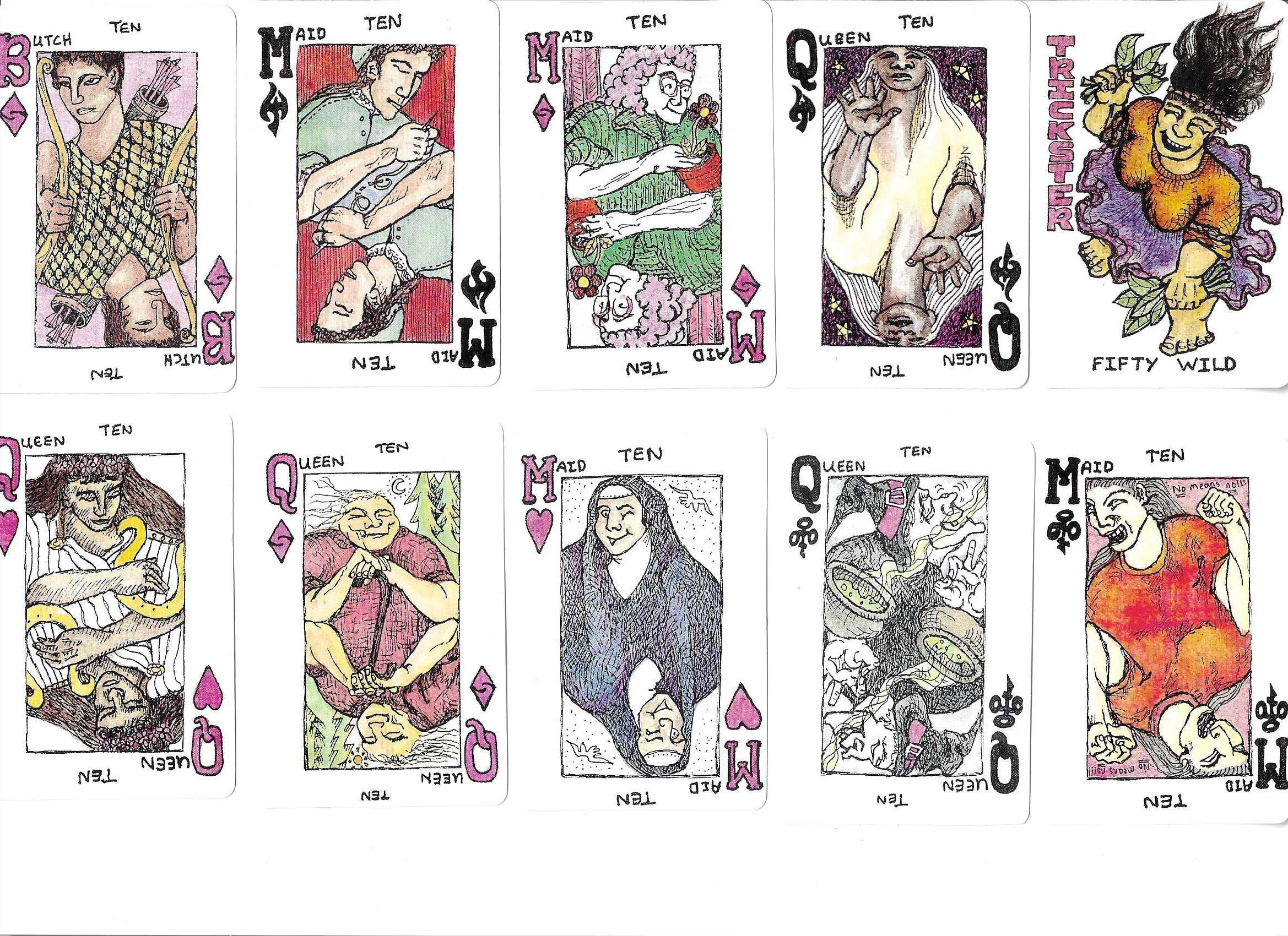 Deck of 52 playing cards - with artistic drawings of Lesbian characters - such as bar dyke, Amazon, Boudicca, nun, Sappho protest marchers and others (see instructions)Use