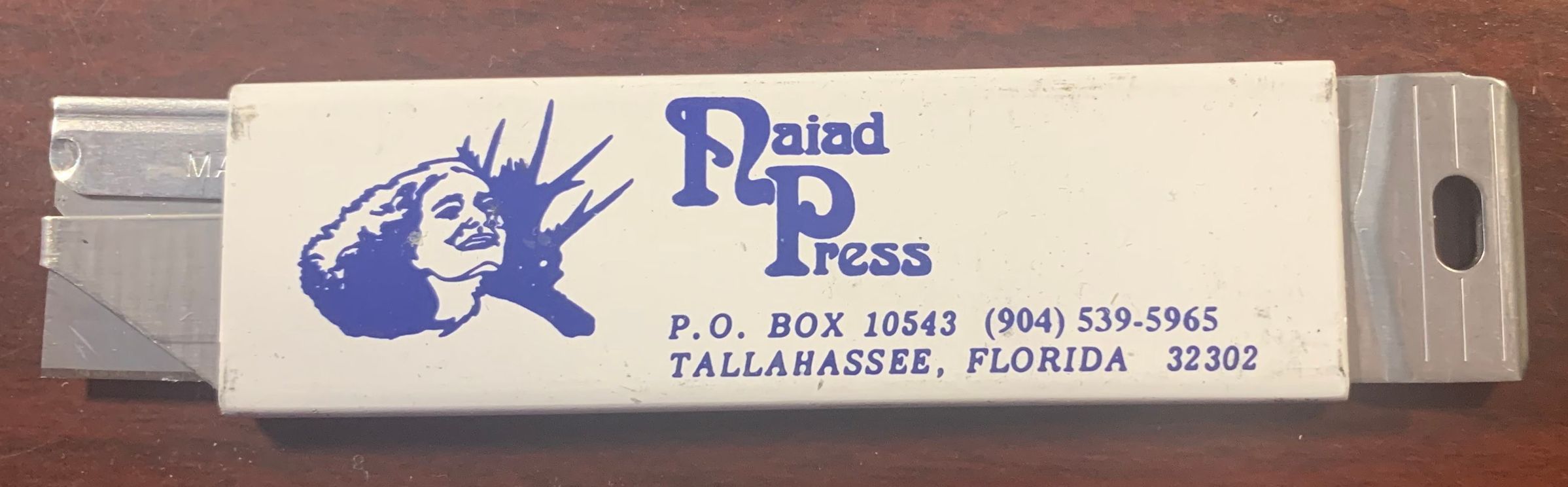 Box cutter (utility knife) with Naiad Press logo and contact information stamped on itUse