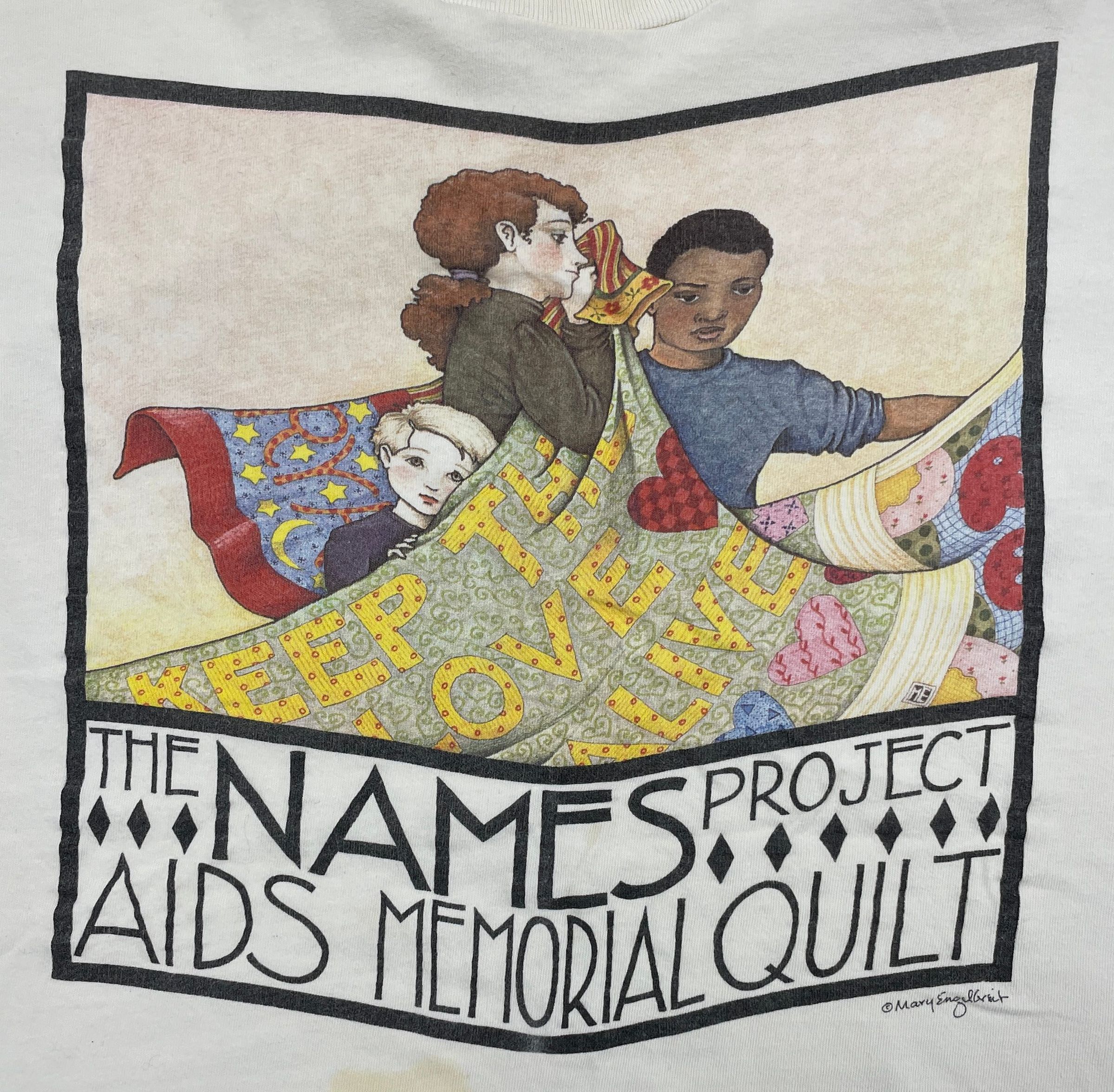 Cream colored t-shirt with extra-large multi-colored graphic depicting three persons working on a memorial quilt. Text (black): The NAMES Project AIDS Memorial Quilt.Use