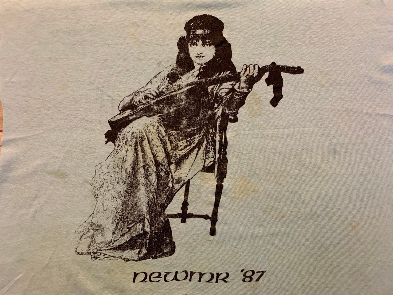 Ancient woman sitting in chair playing stringed instrument.Clothing/Dress/Costume Details