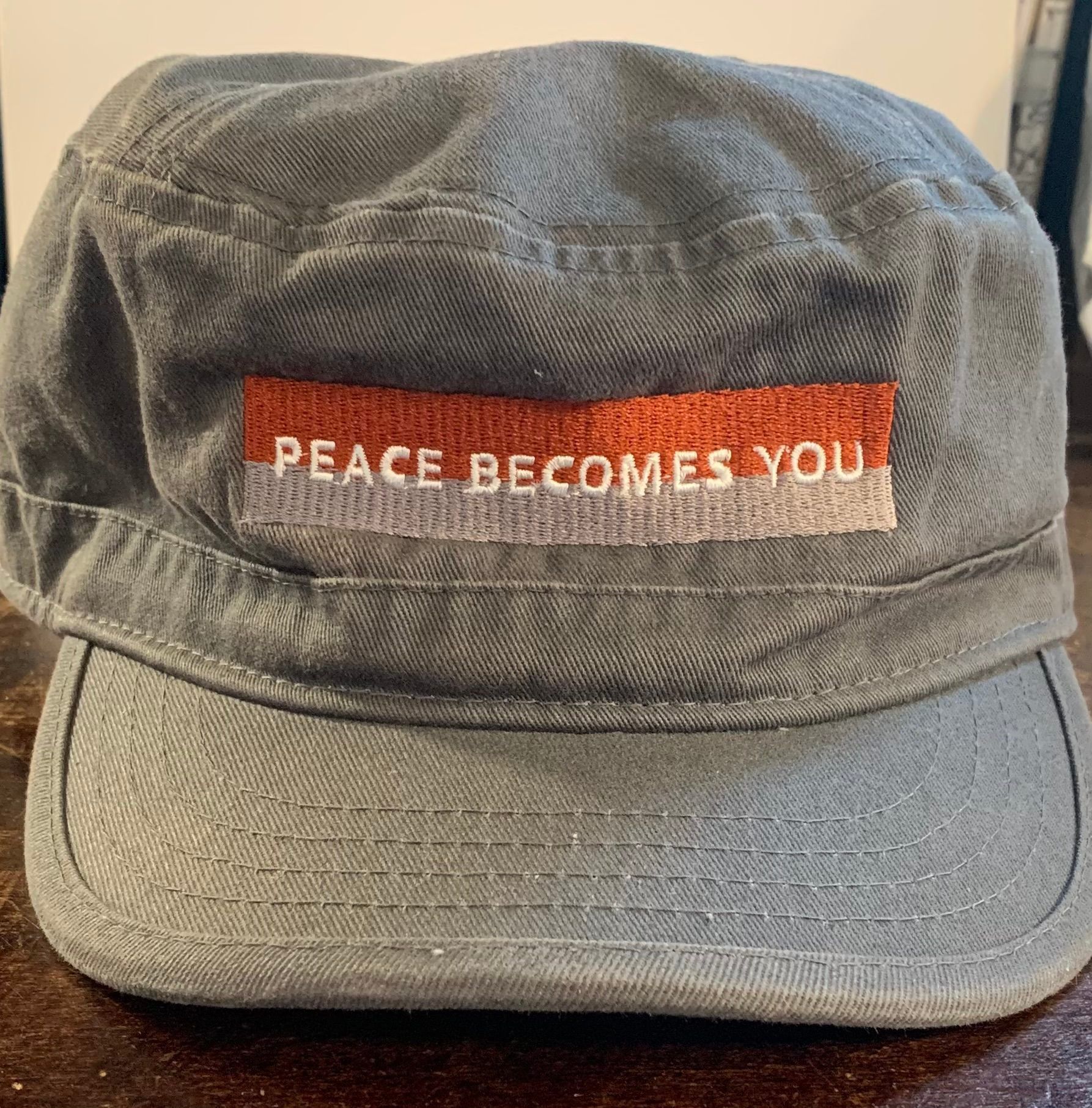 Gray cap embroidered hat with slogan "Peace Becomes You", which features an adjustable velcro strapUse