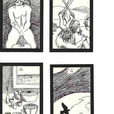 Researcher Notes: Mixing poetry and feminist imagery, A Poet’s Tarot was made by Jesse Cougar in 1986. The deck includes black and white ink drawings on one side, and short poems that expand the card’s meaning on the reverse. The suits have been renamed from Wands to Knives, Cups to Bowls, Swords to Pens, and Pentacles to Sticks. There are no court cards, but rather each suit is numbered between one and thirteen, the number of moons in a year. -- Maya Joncas, 2026Made/Created