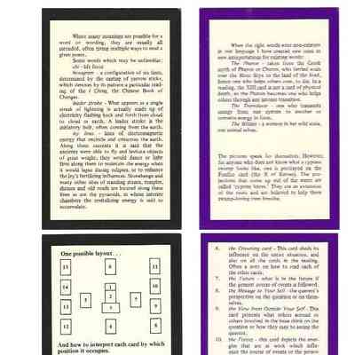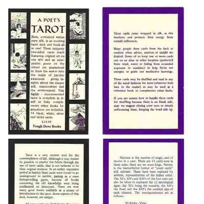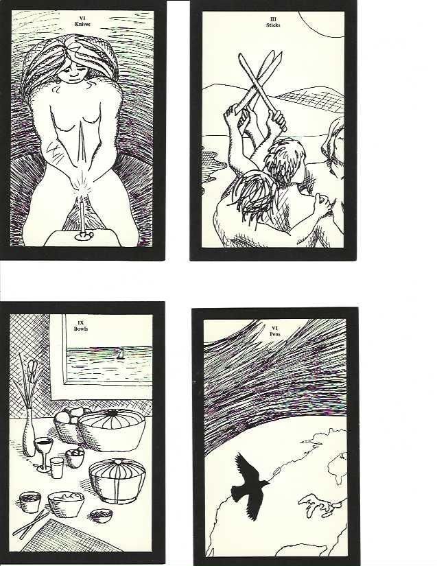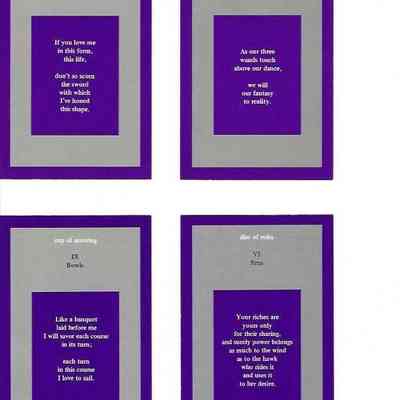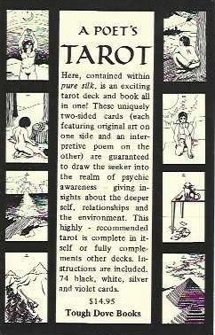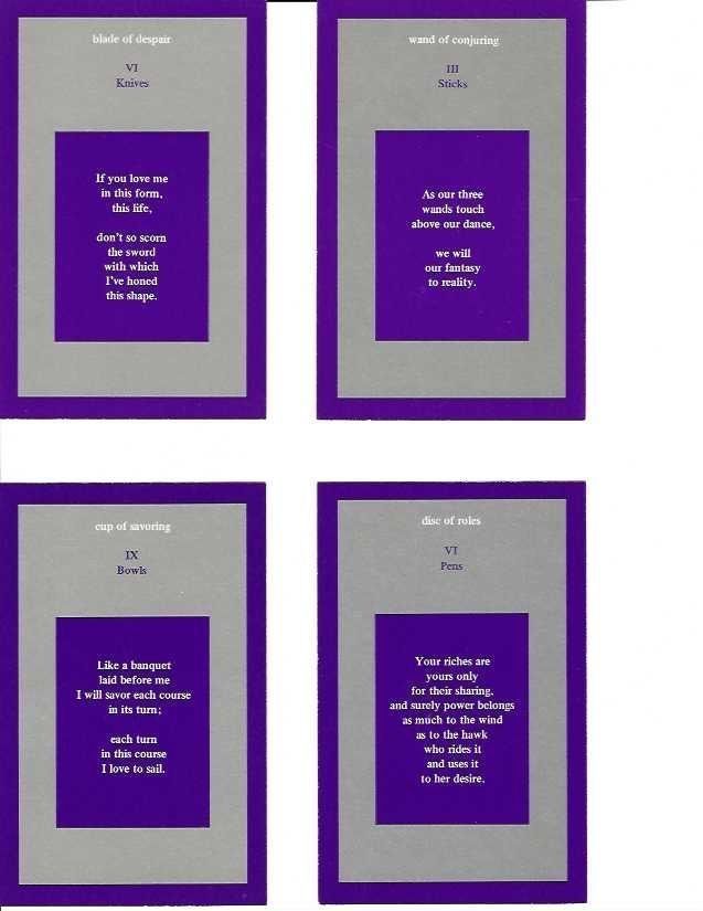 A Poet's Tarot is a women-oriented 74 card deck from 1986. It has black and white non-traditional illustrations on one side, and on the back of each card is a linked poem in purple and silver (instead of a universal design). The suits of Sticks, Bowls, Knives and Pens are numbered from 1 to 13 - there's no distinction made for the court cards.Context