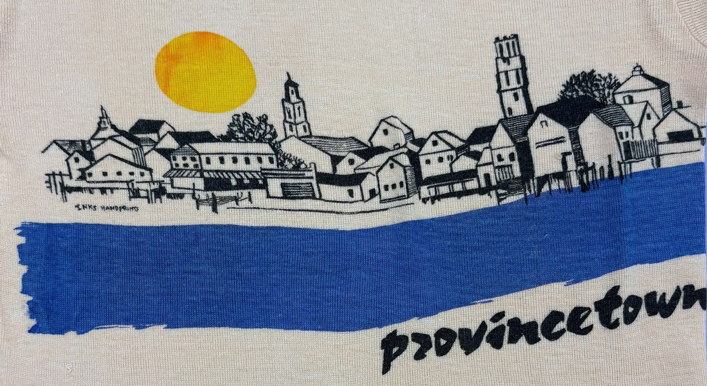 black ink drawing of P'town from the the bay looking over blue water line. Bright yellow sunUse