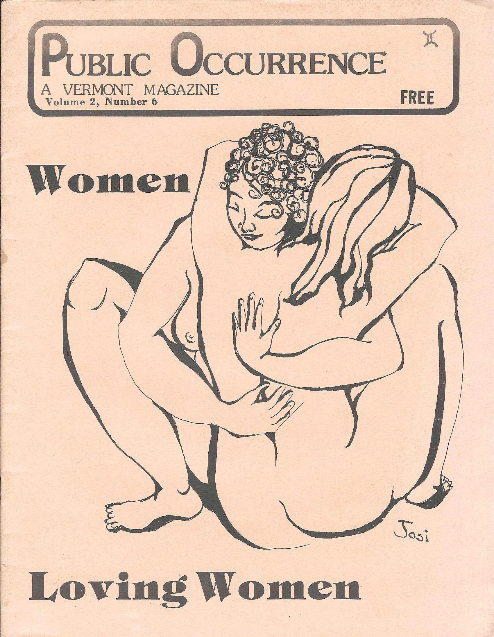 Tracing its name back to the first newspaper in the American colonies published by Benjamin Harris in 1690 ("Publick Occurences,") and established in Vermont in January of 1976 by the Frayed Page Collective, "Public Occurence" set five main goals for itself. First, to develop a communication network in Vermont between social change groups. Second, to provide access to news and ideas ignored or distorted by mainstream media. Third, to offer an outlet for diverse forms of expression and public testimony. Fourth, to support and assist resistance movements. Fifth, to demonstrate the relationship between cultural and political change. Originally affiliated with the Catholic Tribune, the issuance of the May 1976 edition, entitled "Women Loving Women," terminated that relationship.Publication Details