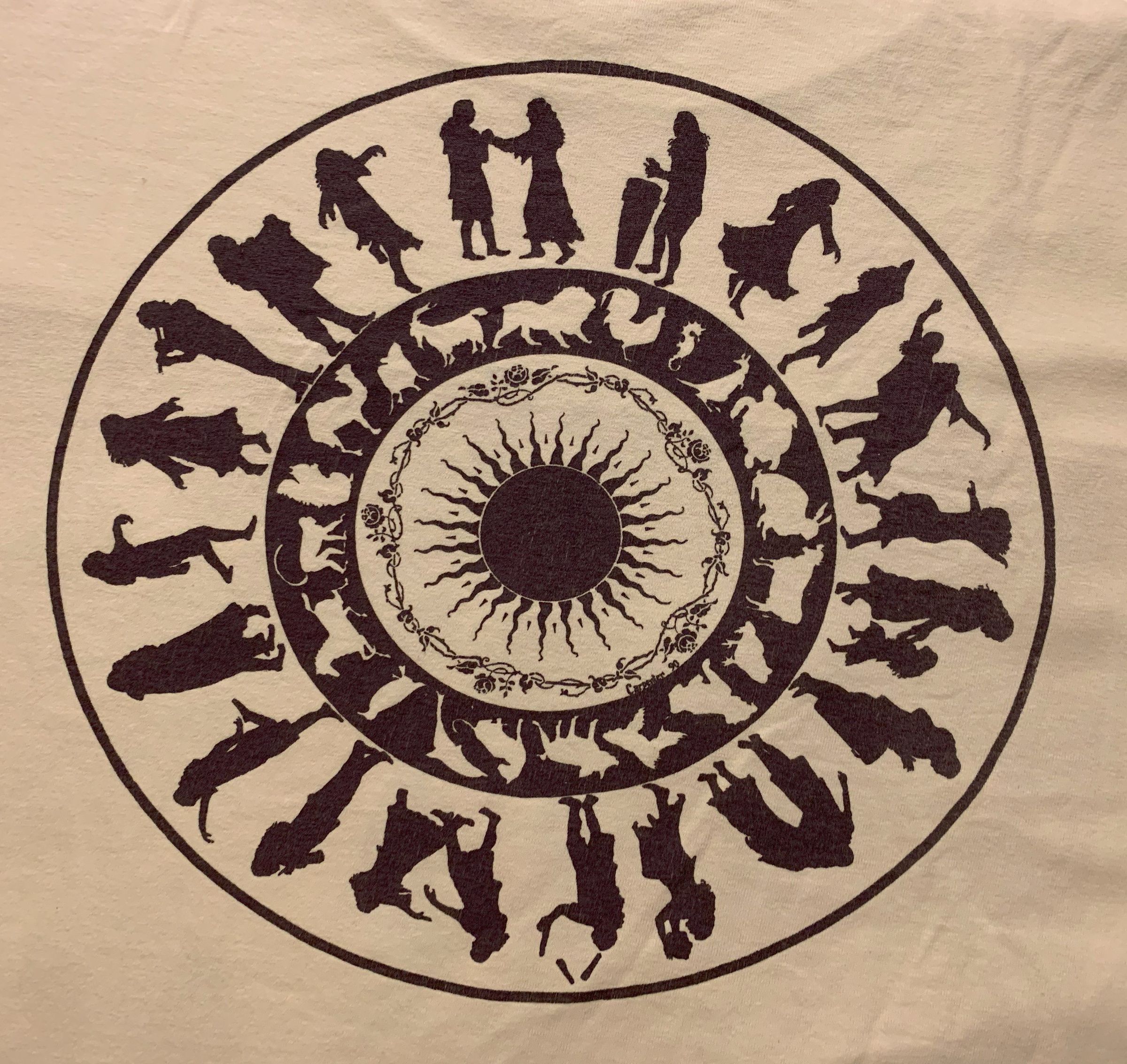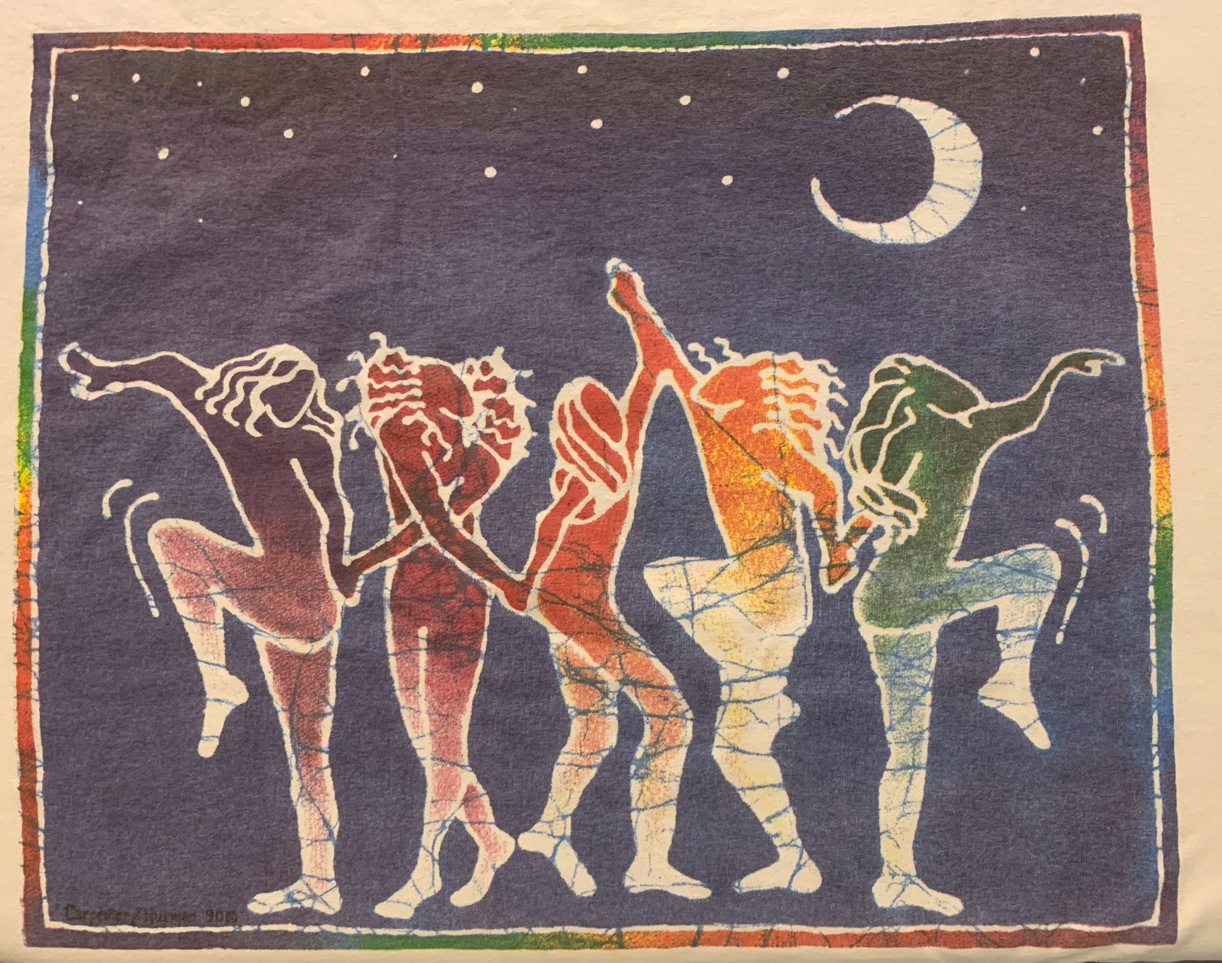 Rainbow dancing women. Back design of women dancing with animals in circle of life.Clothing/Dress/Costume Details