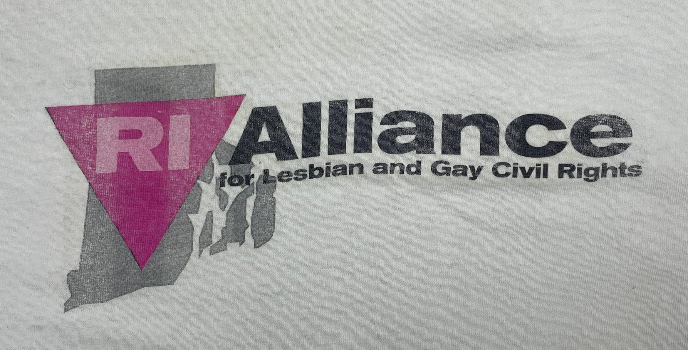 A cream t-shirt with the logo for the RI Alliance for Lesbian and Gay Civil Rights with a pink triangle and the Rhode Island state silhouette.Context
