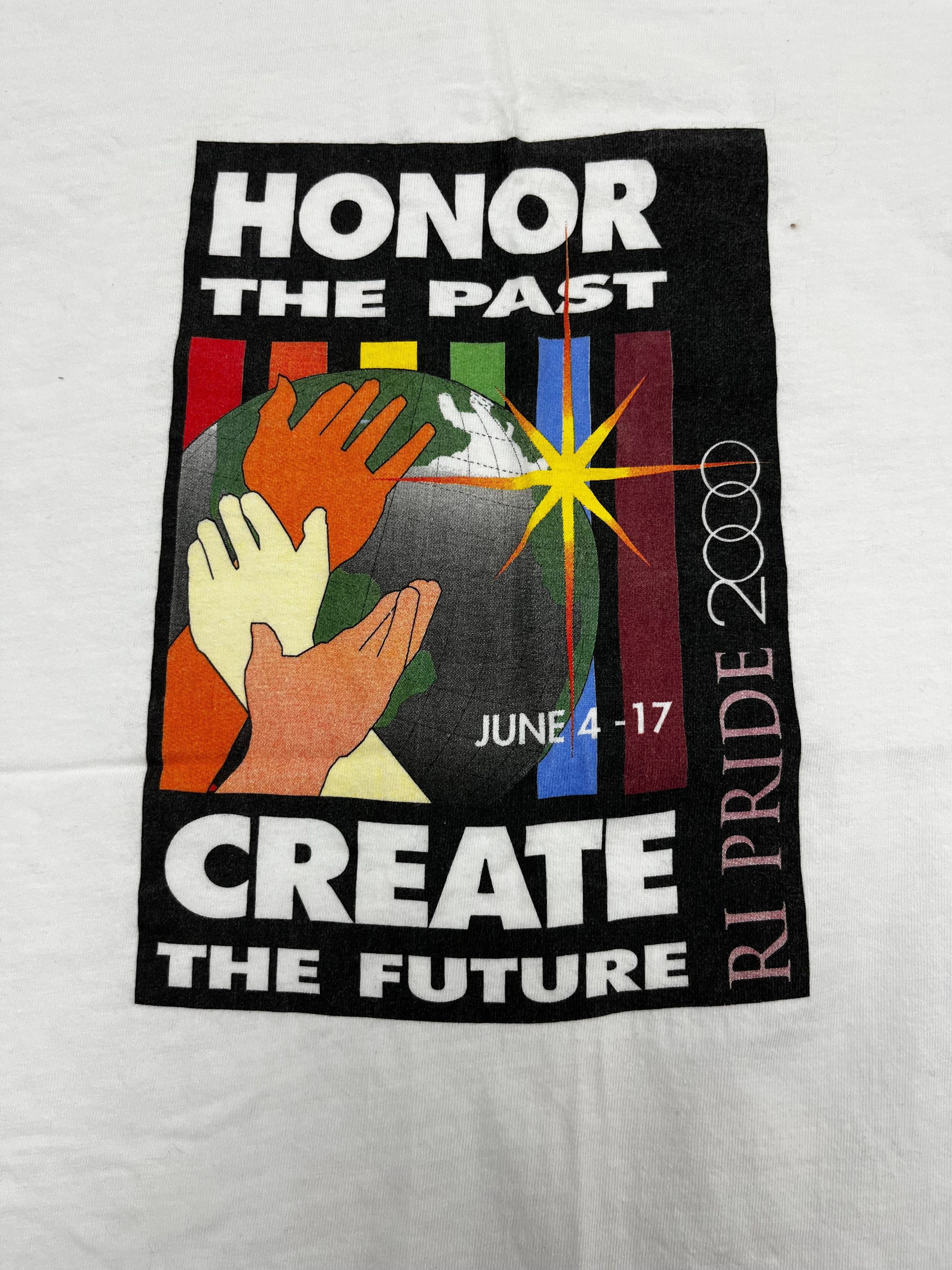 White t-shirt and large graphic. Graphic has black background, rainbow-colored bars, a globe, three hands of different colors. Text reads: Honor the Past Create the Future / June 4-17 / RI Pride 2000Use