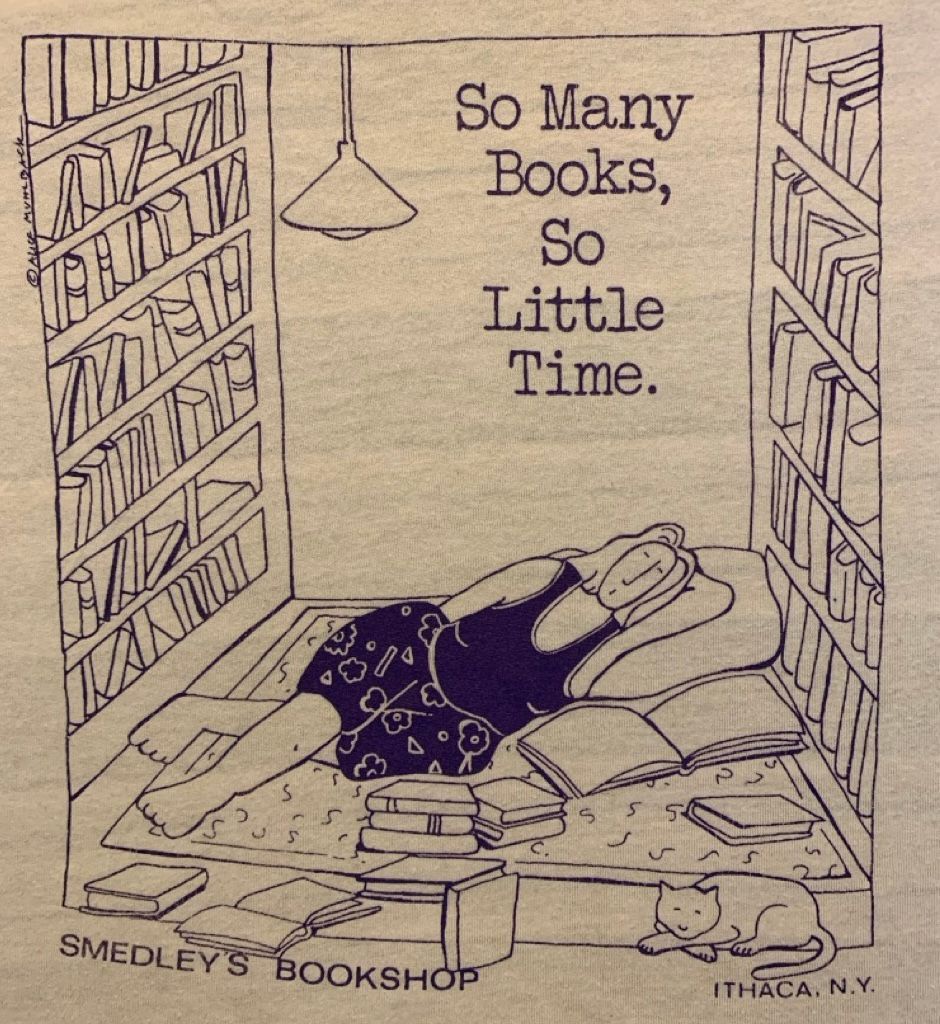 Text: So Many Books, So Little Time - with woman lounging on pillows and surrounded by books with cat sleeping nearbyClothing/Dress/Costume Details