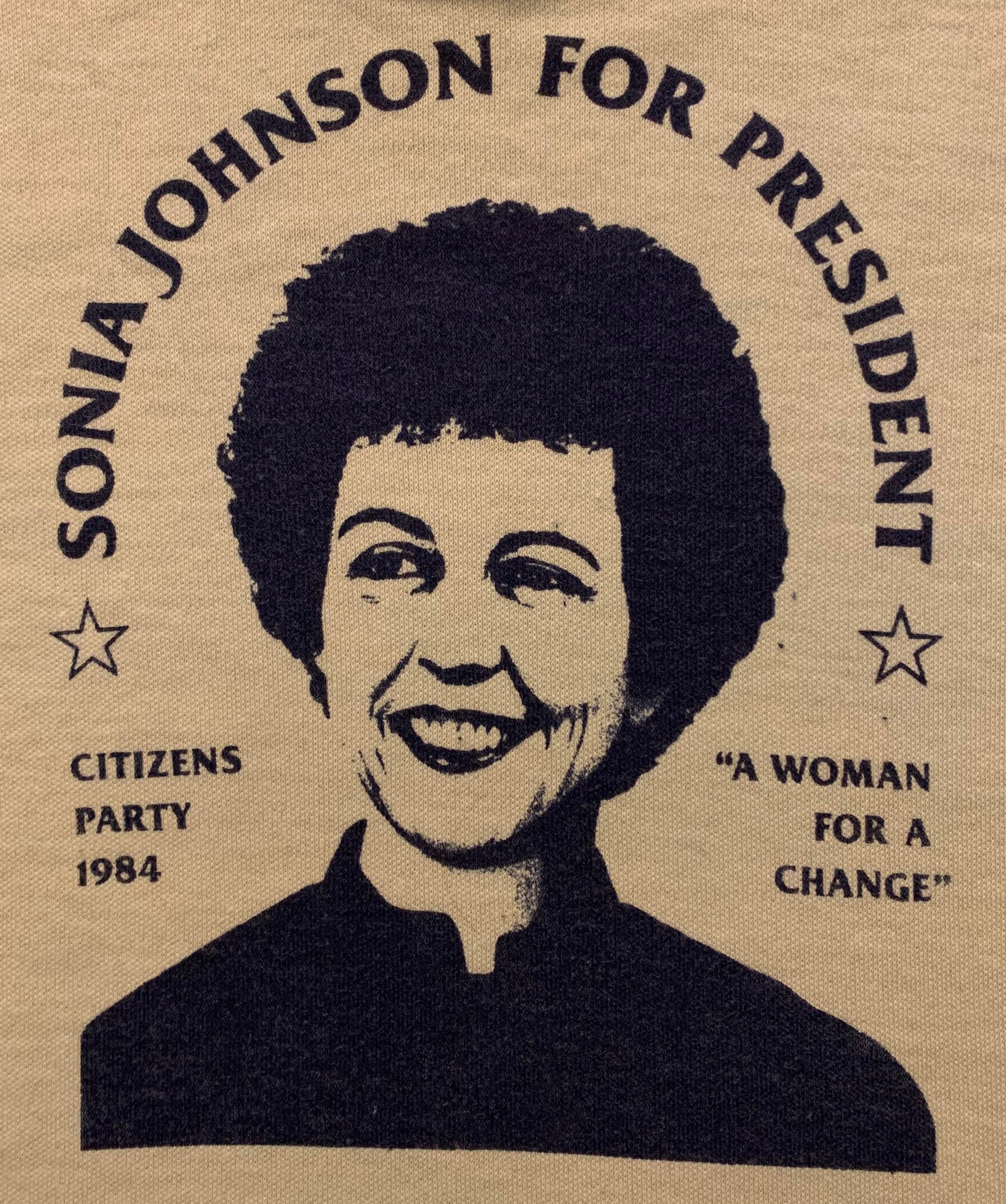 Image of Sonia Johnson with text: "A woman for a change".Clothing/Dress/Costume Details