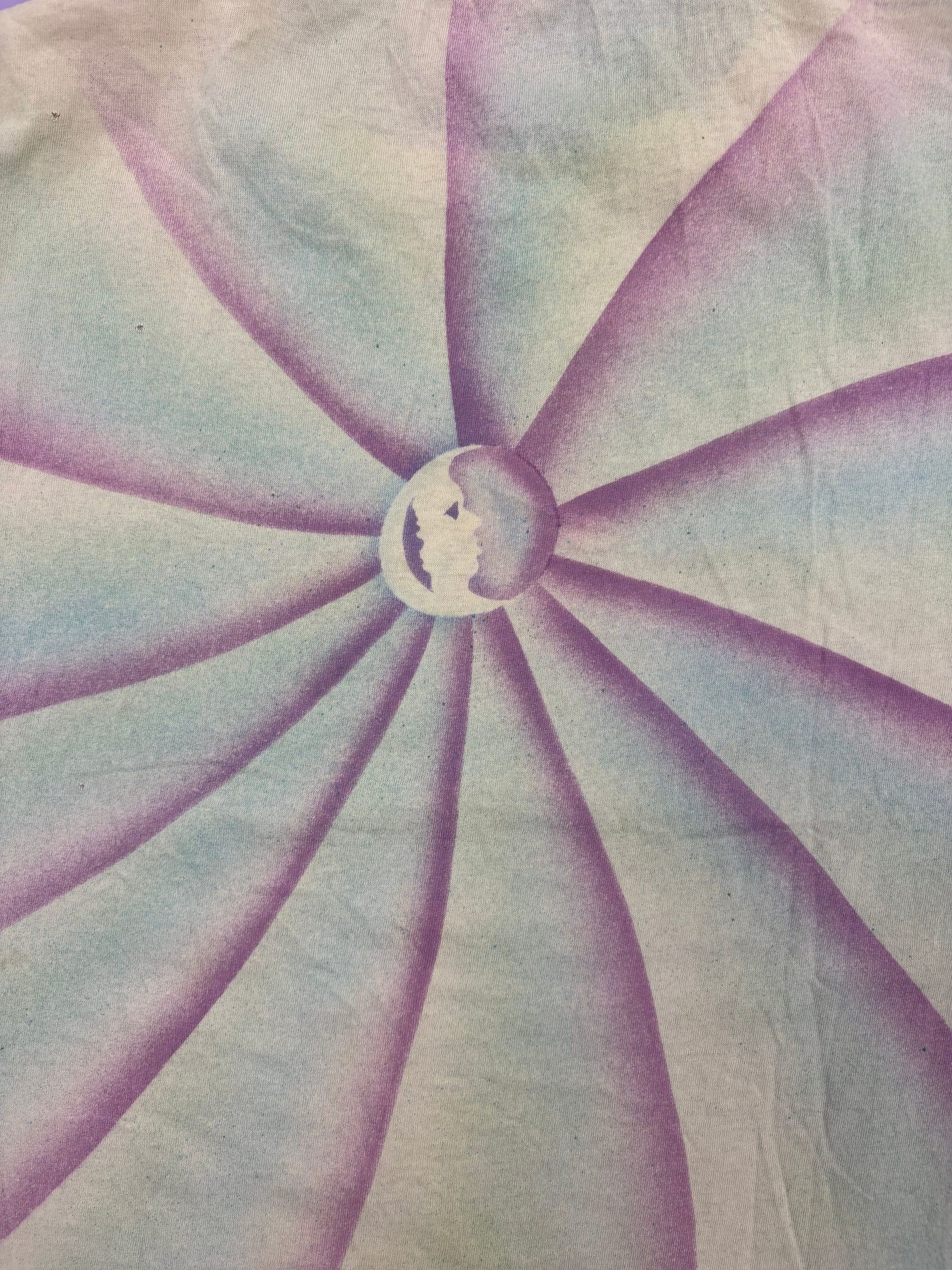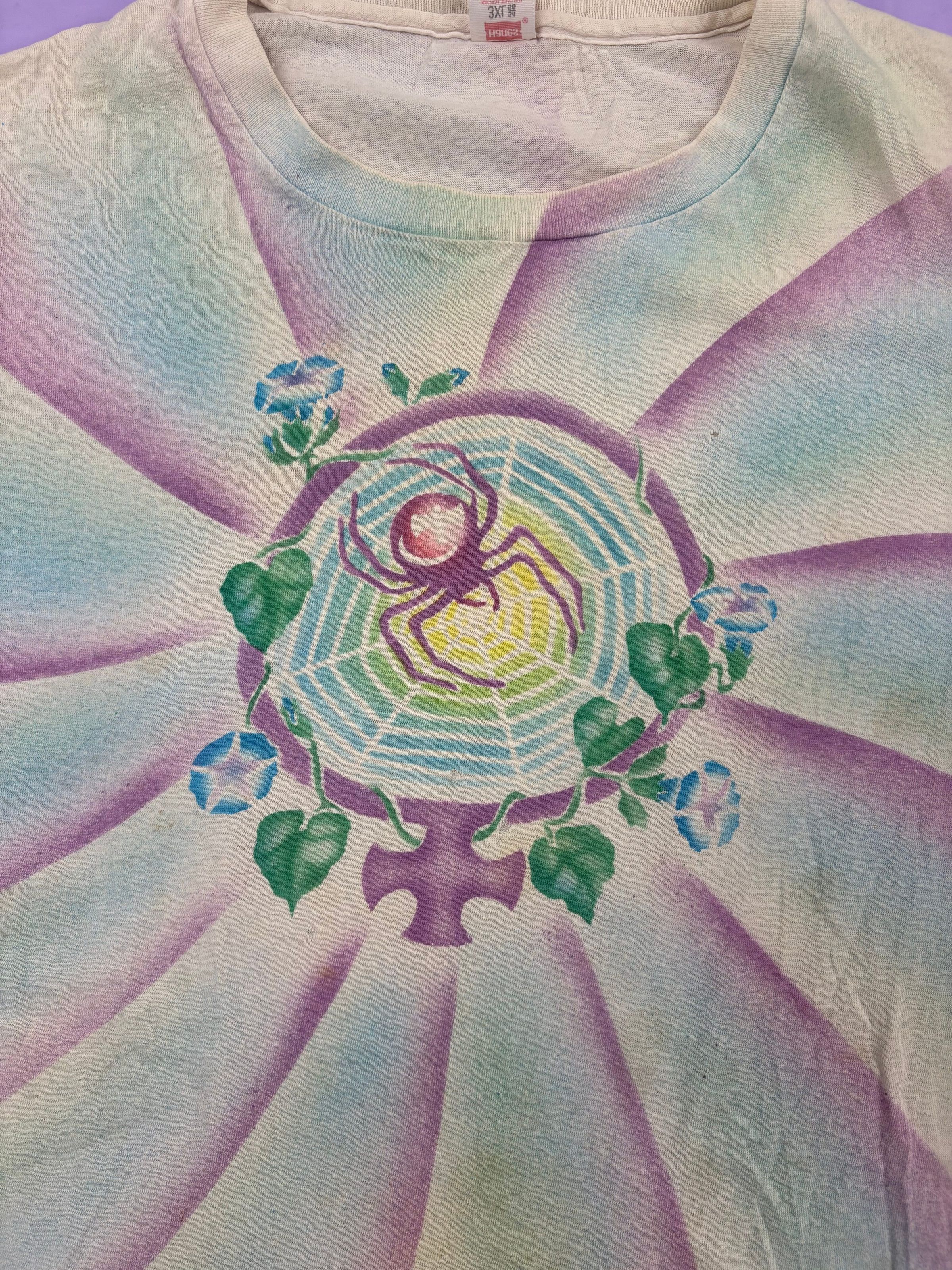 tie-dye with multicolors - front has swirl pattern - Lavender women's symbols with web center with morning glories wrapping the women's symbol. Purple spider has labrys and moon on its back. Back also has swirls. moon in center has face of a womanClothing/Dress/Costume Details