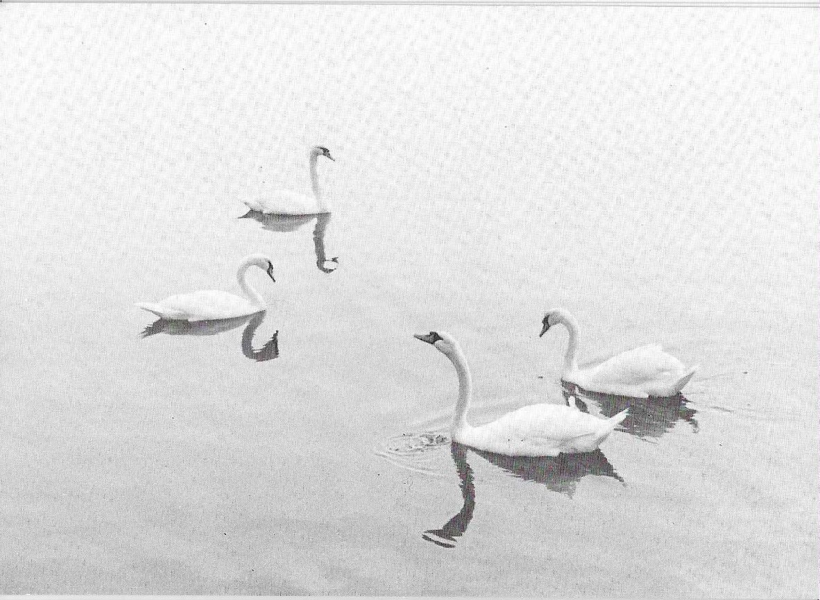 Postcard - black and white photograph of four swans on the waterArtwork Details