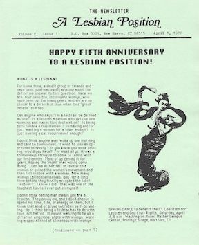 Linda Anderson speaks about her experience as one of the founders of ‘The Newsletter: A Lesbian Position,’ a community newsletter for Lesbians in and around New Haven, CT (1982- 1992). The publication aimed to connect and inform the local Lesbian community and was produced through collective efforts. “It’s not the Lesbian position, it’s just “A” Lesbian position .... we were very deliberate about that. We didn’t want to brand ourselves as “the” Lesbian position, as if we’re the authority. This is just one Lesbian position.”