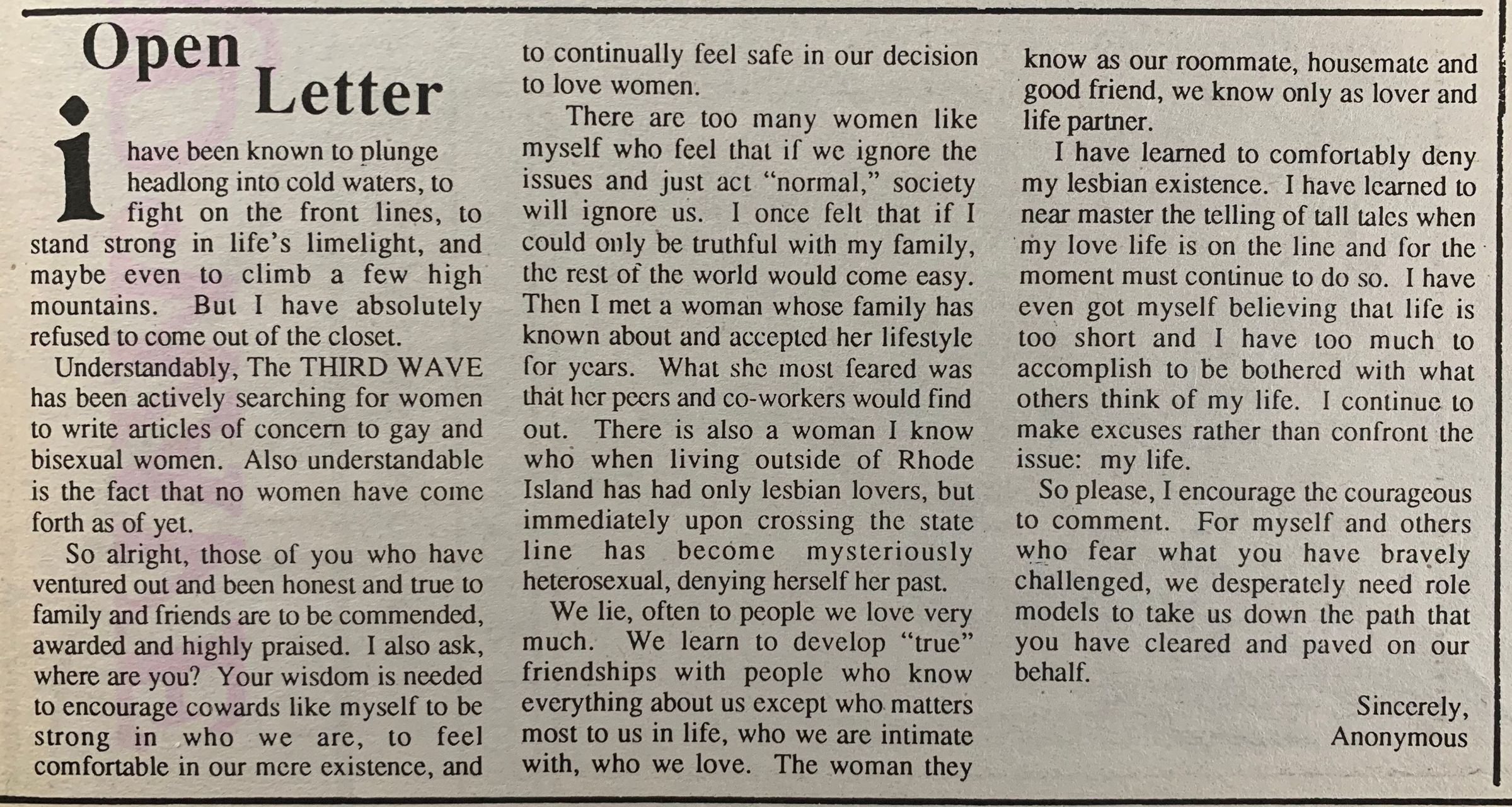 The Third Wave, served as a vital platform for feminist dialogue, news, and resources across the state. Created entirely by volunteers, it provided a space for voices from various feminist organizations and individuals, offering insight into issues ranging from domestic violence prevention to civil rights legislation and actions, to LGBTQ+ advocacy. It is notable that most of the volunteers who produced The Third Wave were lesbians, reflecting the overlapping feminist and LGBTQ+ communities in Rhode Island.Category