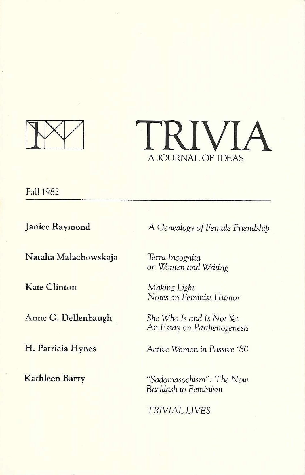 "Trivia: A Journal of Ideas" published serious feminist thought in the form of essays, translations, reviews, and experimental writing. Contributors included: Janice Raymond, Andrea Dworkin, Mary Daly, Lise Weil, Paula Gunn Allen, Jewelle Gomez, Gloria Anzaldua and many others.