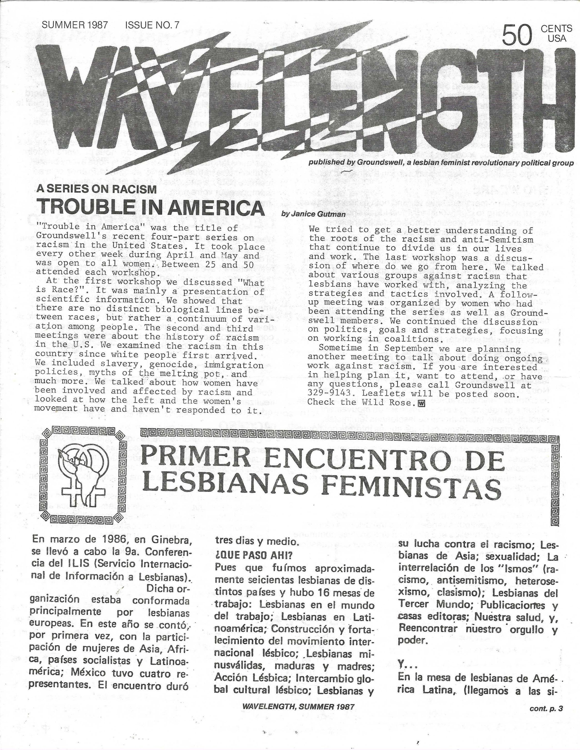 Internationalist, revolutionary lesbian newsletter. Multilingual, primarily English and Spanish, also German. Topics cover broad subjects with singular revolutionary feminist focus.