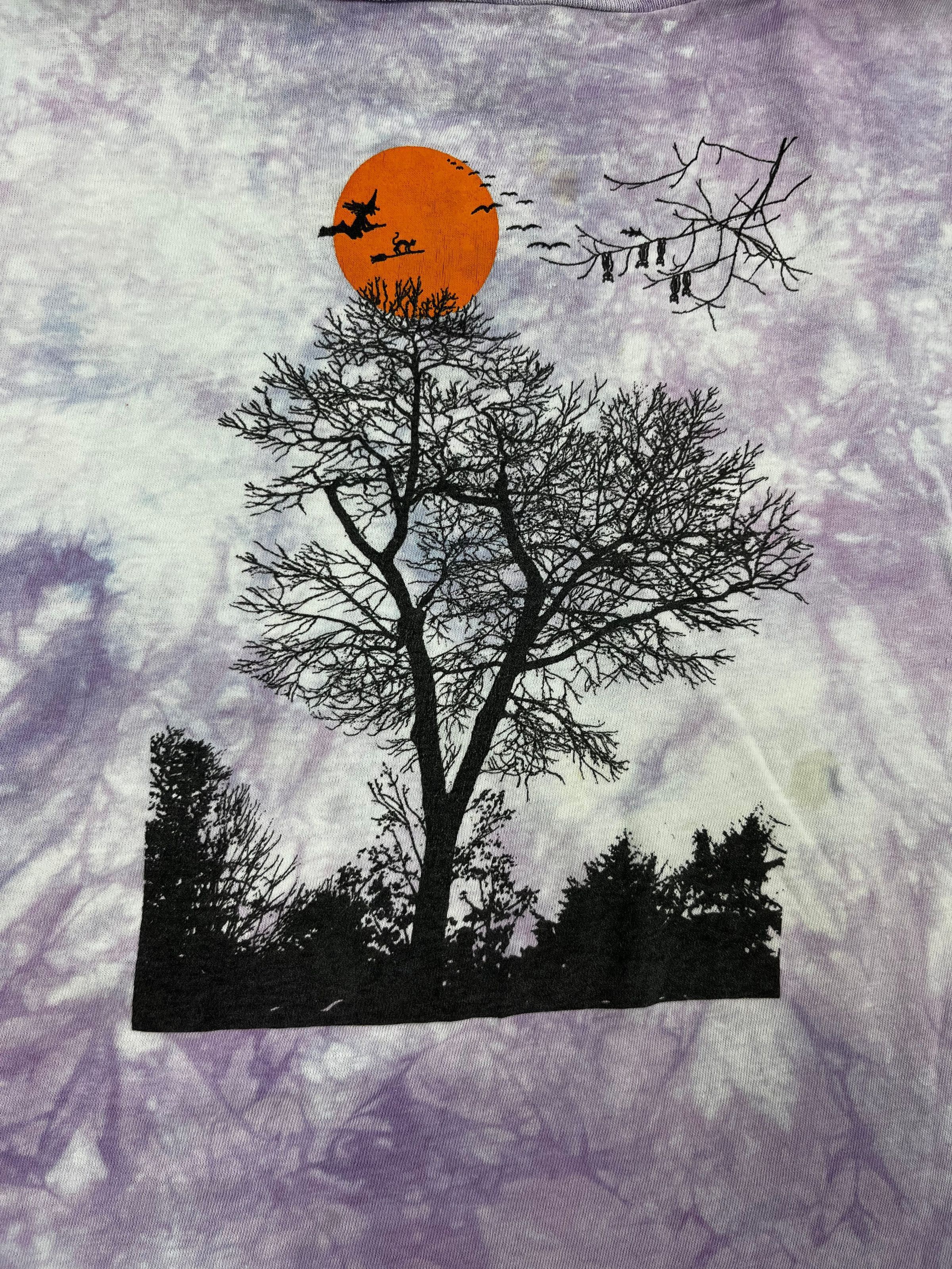 Tie-dyed t-shirts with silhouette in black of tree, branches, and owls with organge oon and image of witch on broom and cat on broomClothing/Dress/Costume Details