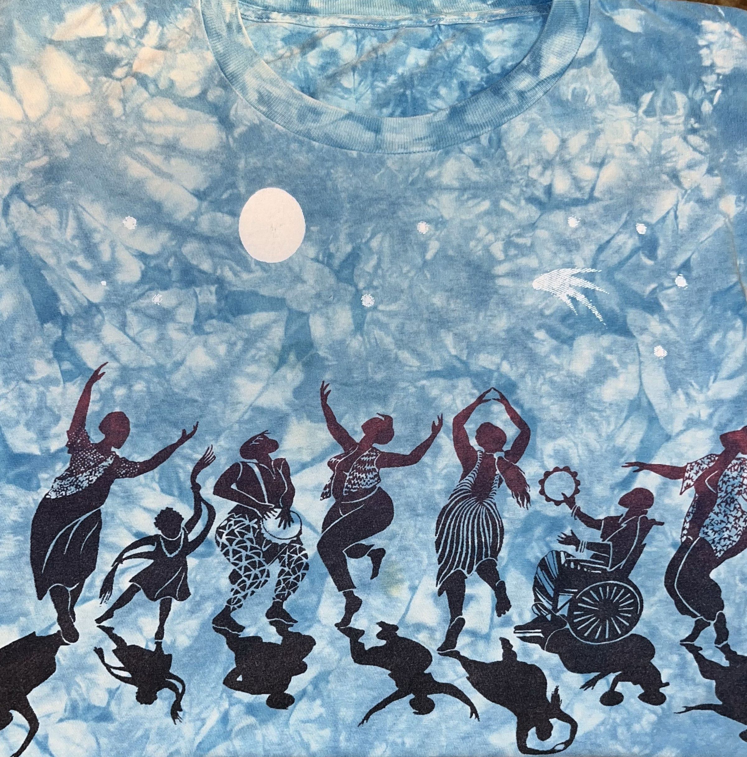 6 women (one in a wheelchair) and a girl dancing and drumming under the full moon - blue tied dyedClothing/Dress/Costume Details