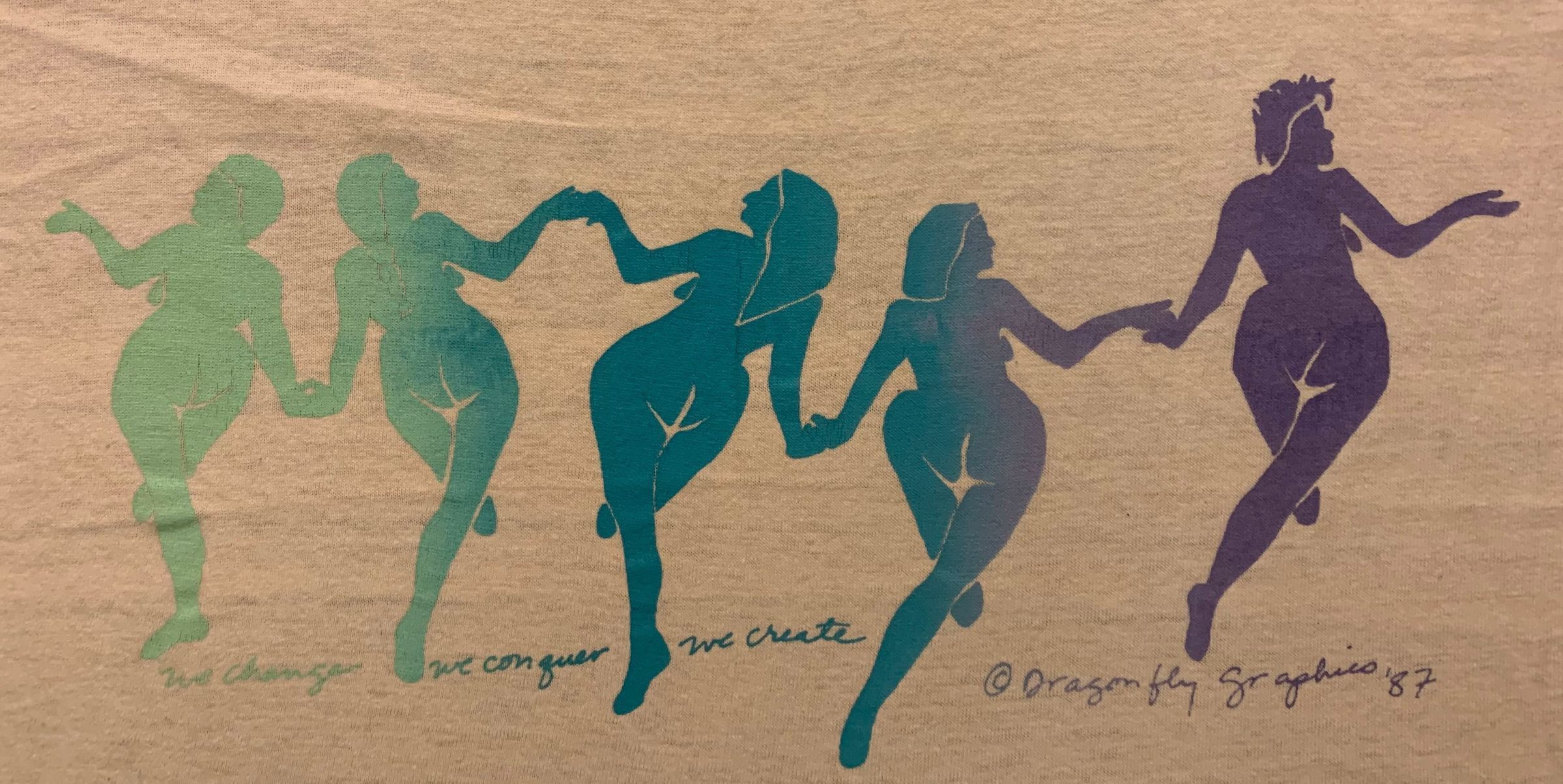 Five naked women holding hands, dancing - with words: We change. We conquer. We create.Clothing/Dress/Costume Details