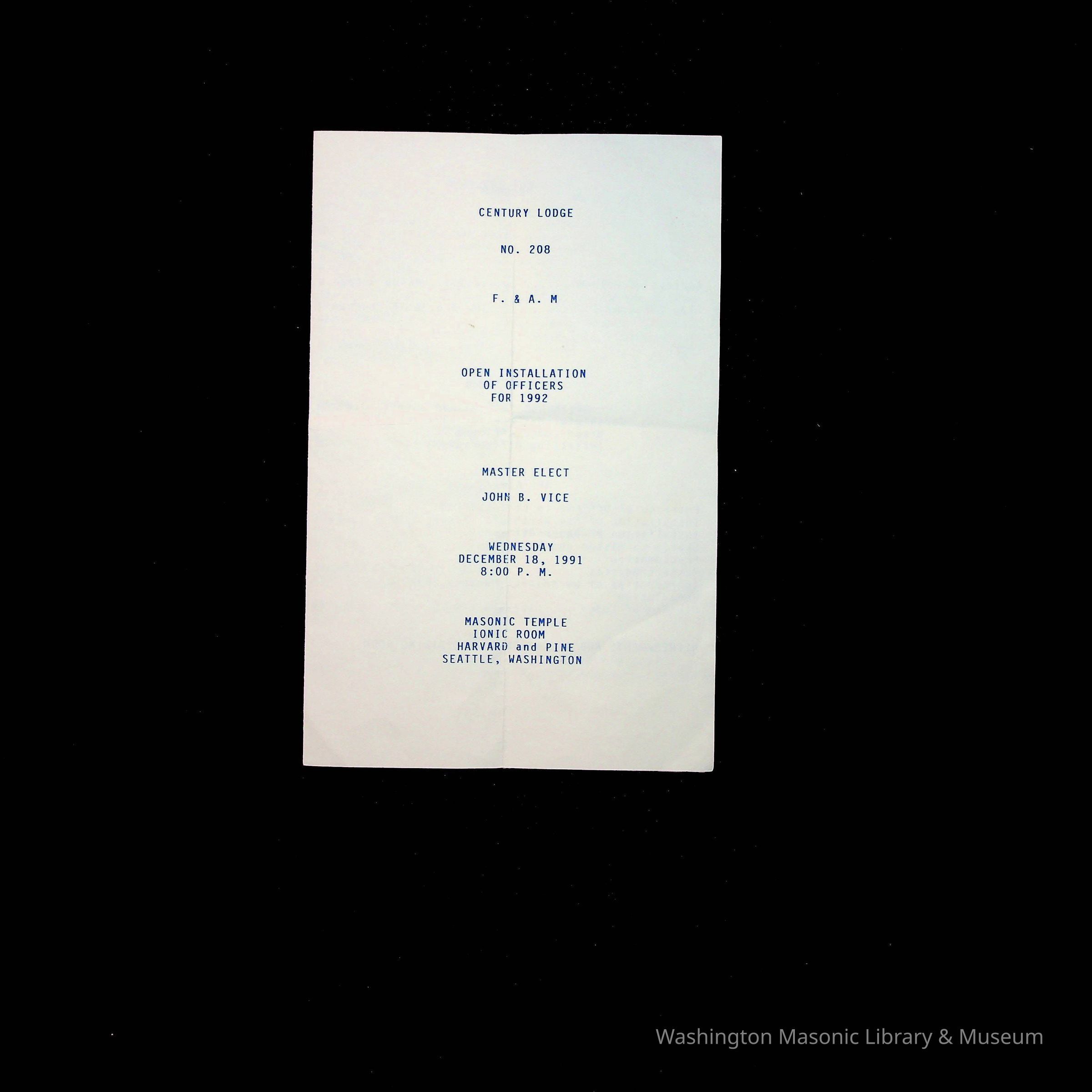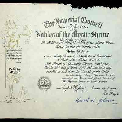 Note with ephemera sent in with apron reads: "Questions about John Vice? contact his widow Nancy Kirkner, nkirkner@aol.com. Programs are from his installation as lodge master and RAM High Priest. Memorial has obituary."Create Date