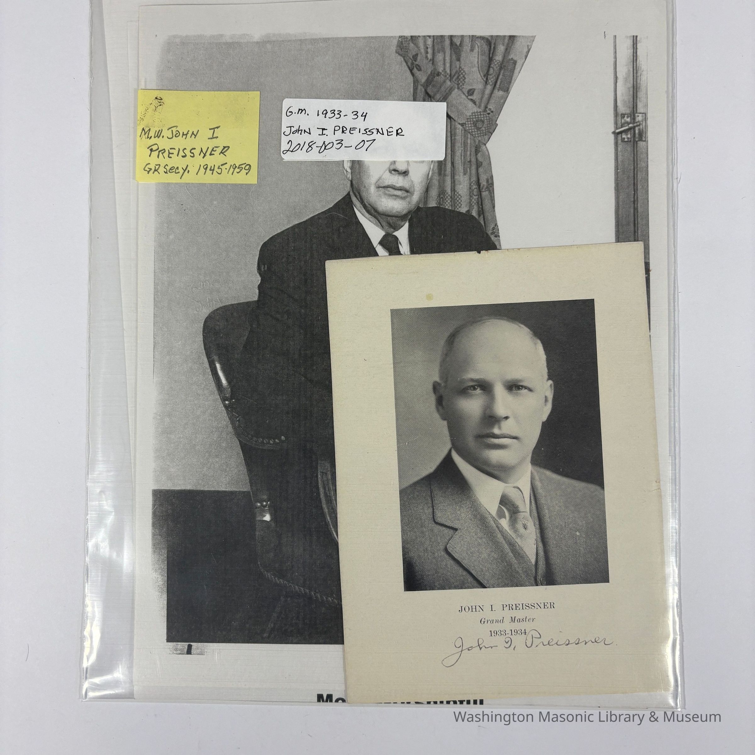 2 Photographs and Prints: PGM John I. Preissner (1933-1934). Preissner was also Grand Secretary (1944-1960).Entry/Object ID