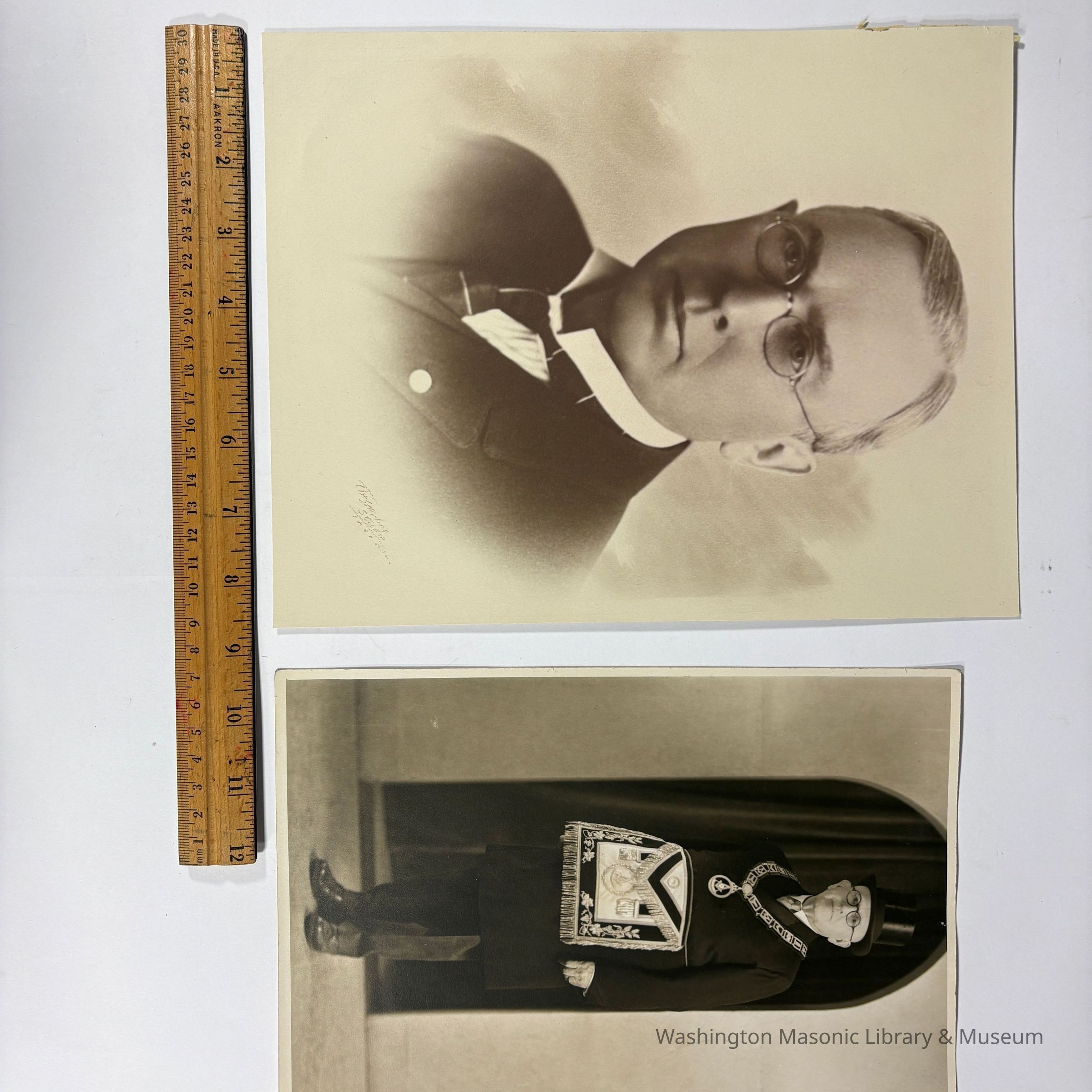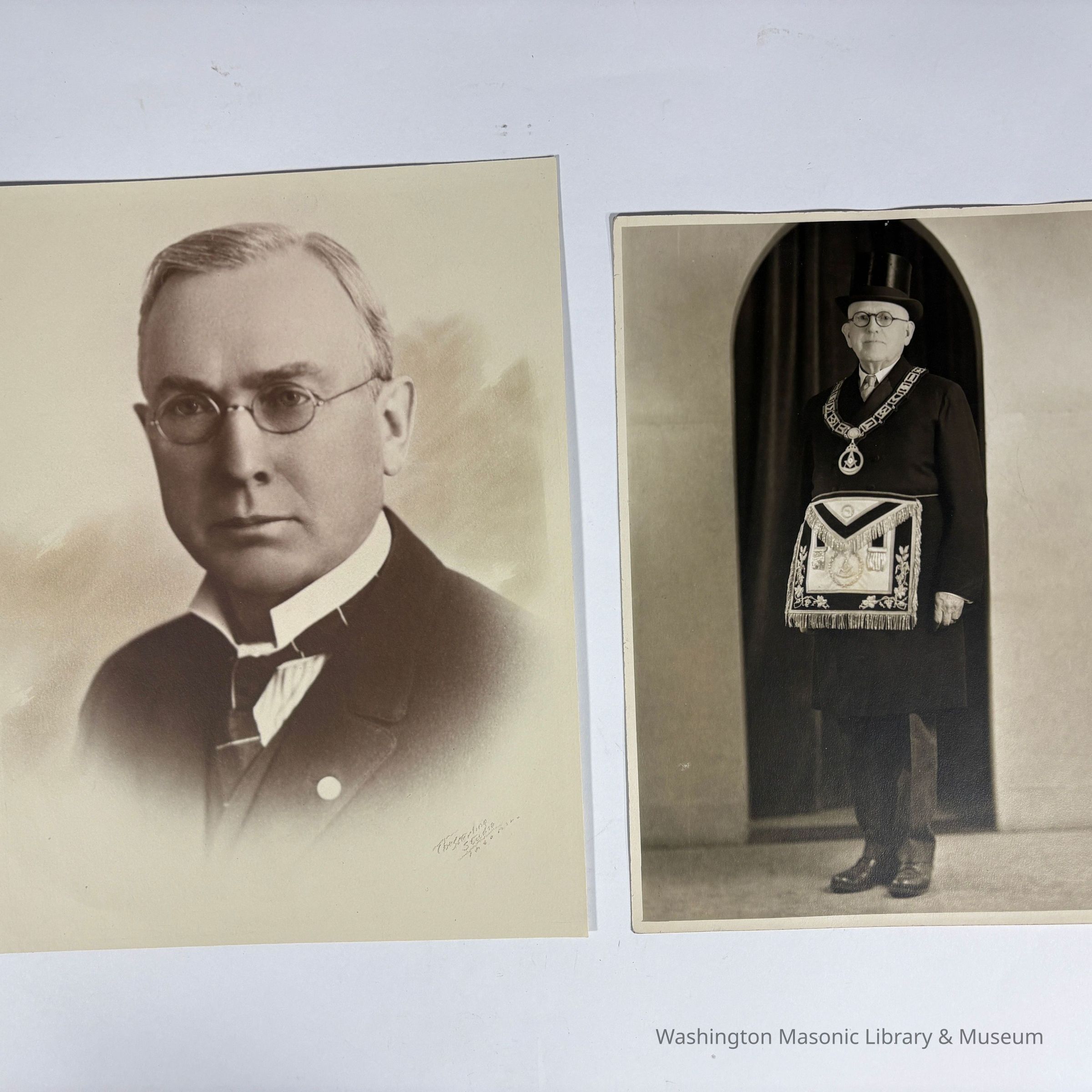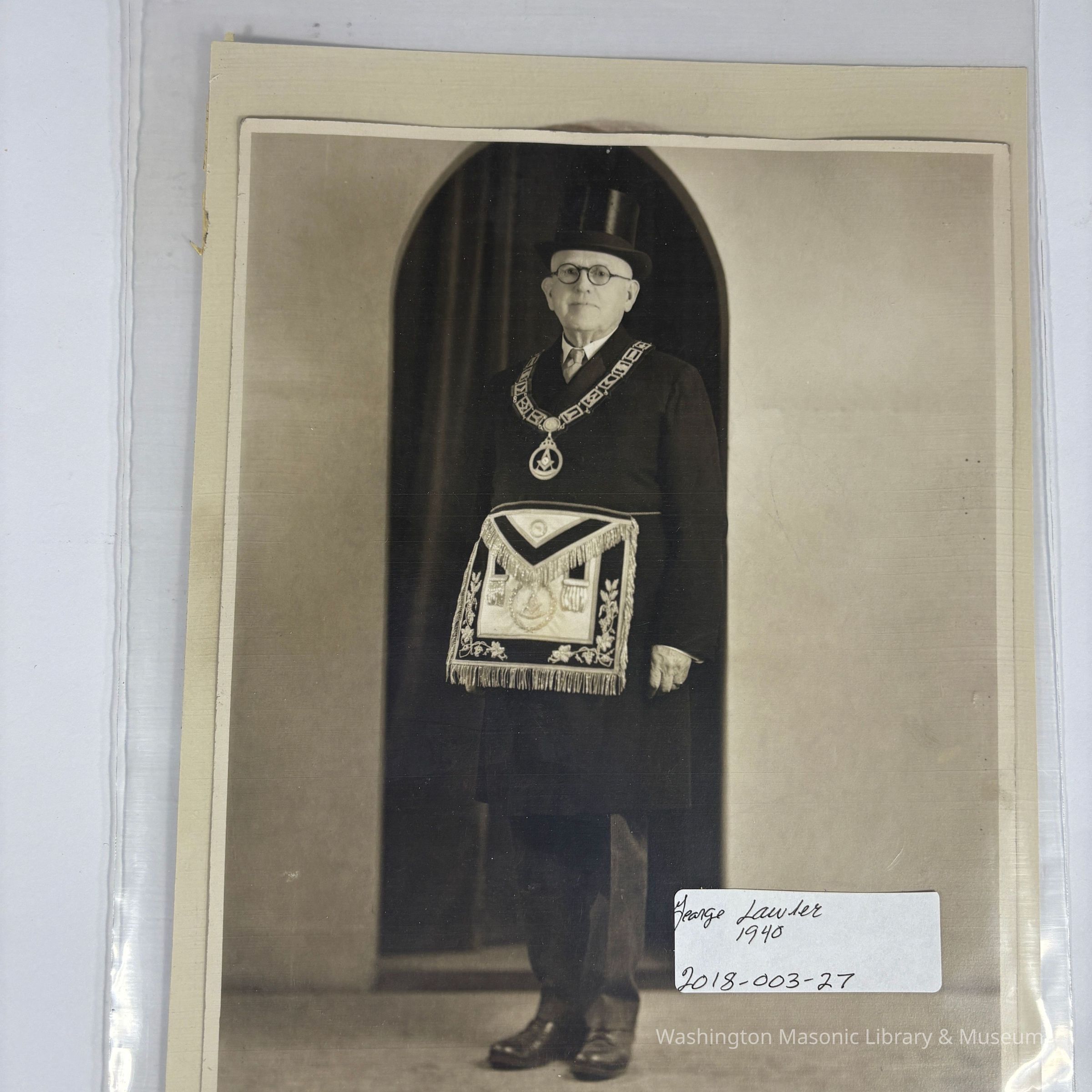 a) Wearing Grand Master's Apron and collar. With tophat. Possibly with Lawler's signature on back.