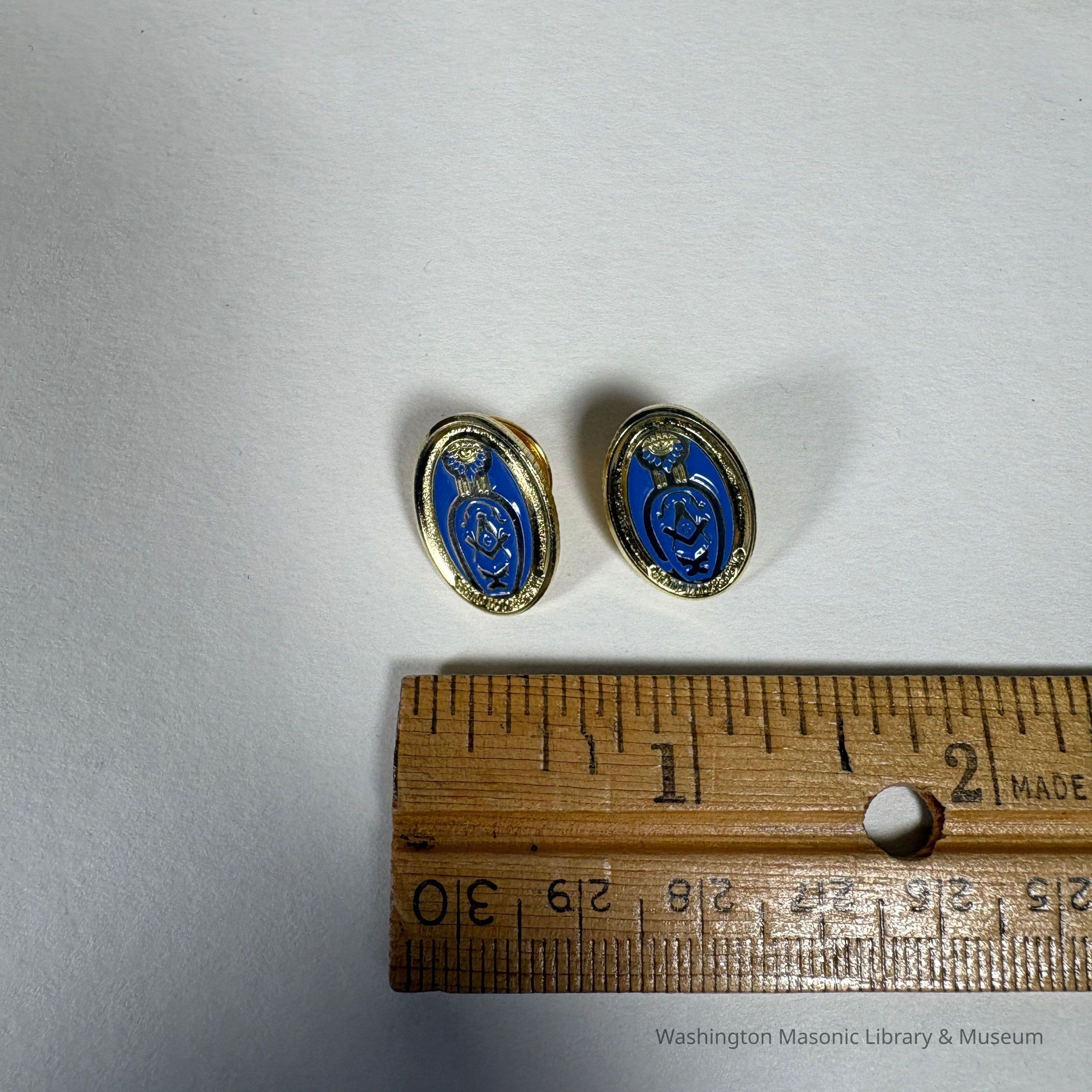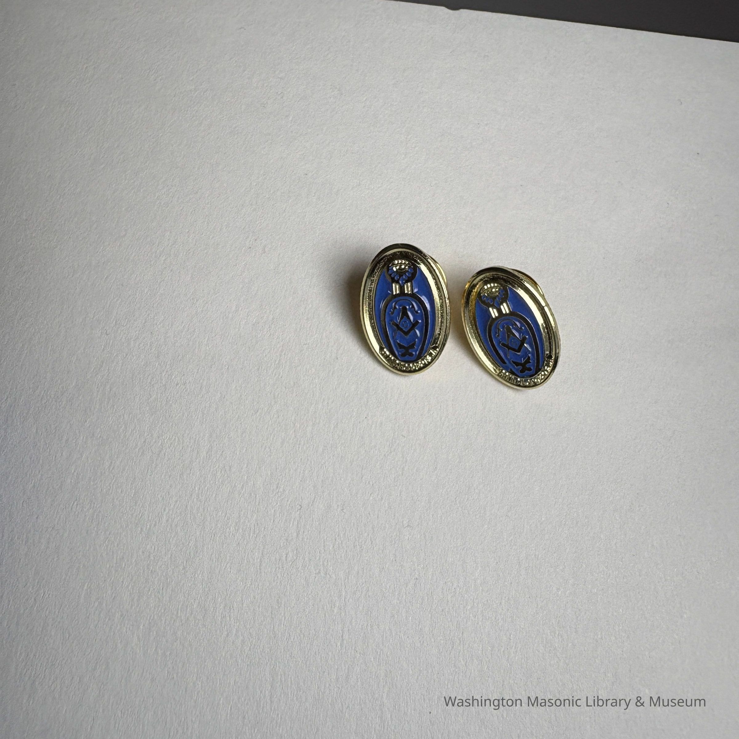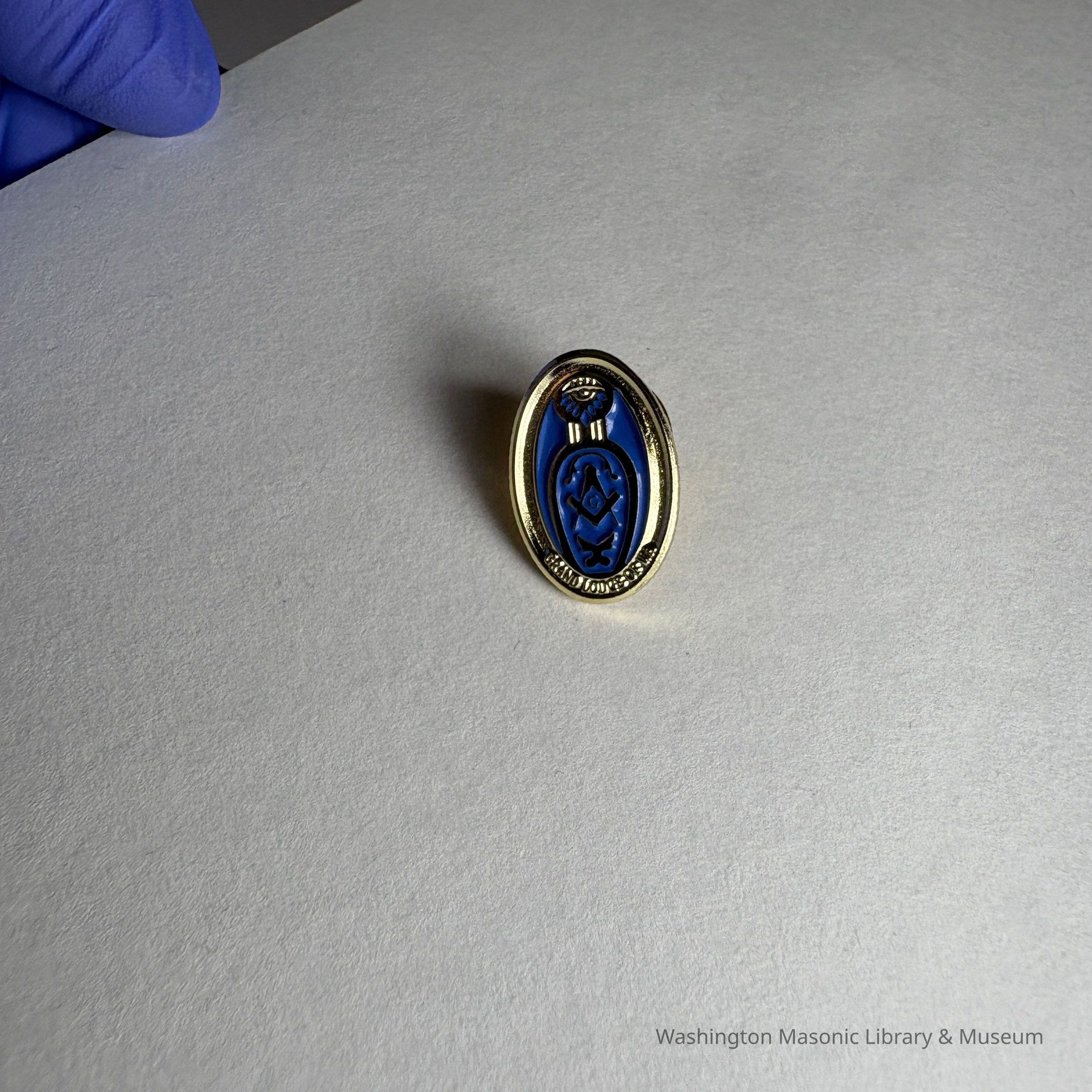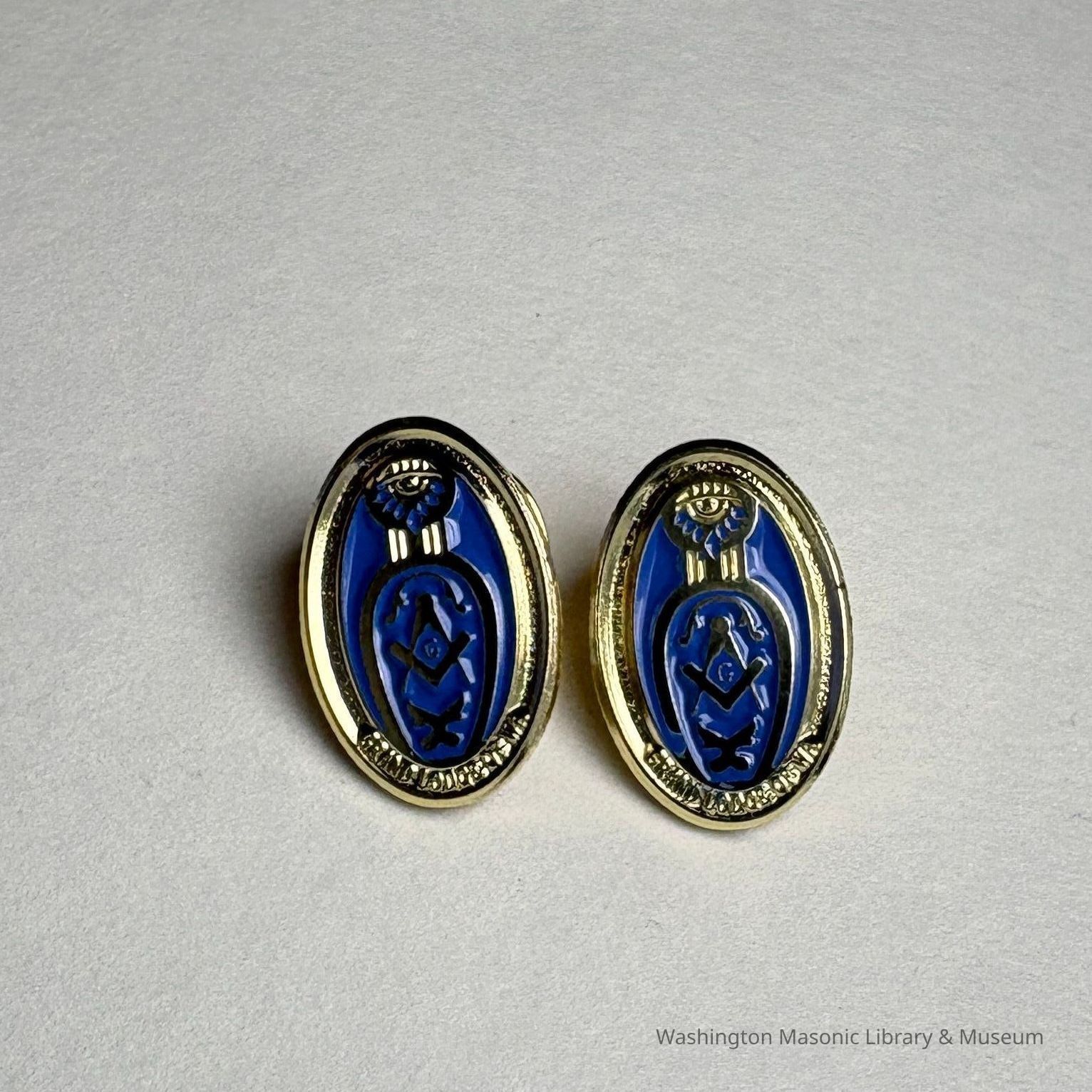2 Pins: Blue and Gold. Oval with Masonic symbols inside a blue slipper. Two Lady of the Grand Master Pins. Martha Nelson, wife of MW Roger Nelson (2025-2026).Collection