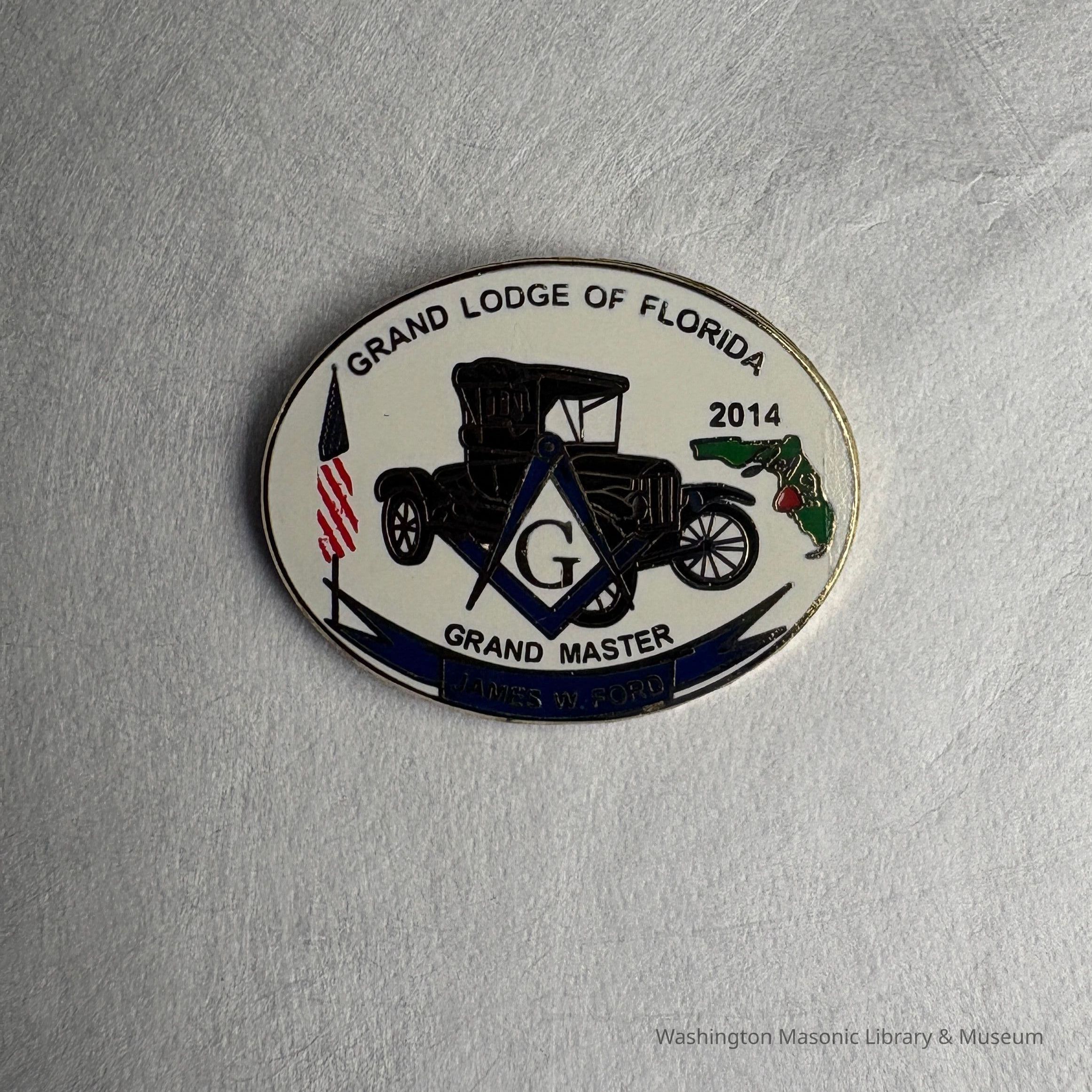 Pin: Oval, with a Ford automobile, square and compass, american flag, and state of florida outline. "Grand Lodge of Florida: Grand Master James W. Ford (2014)" Presumably collected by PGM Sam Roberts during his year as Grand Master.Collection