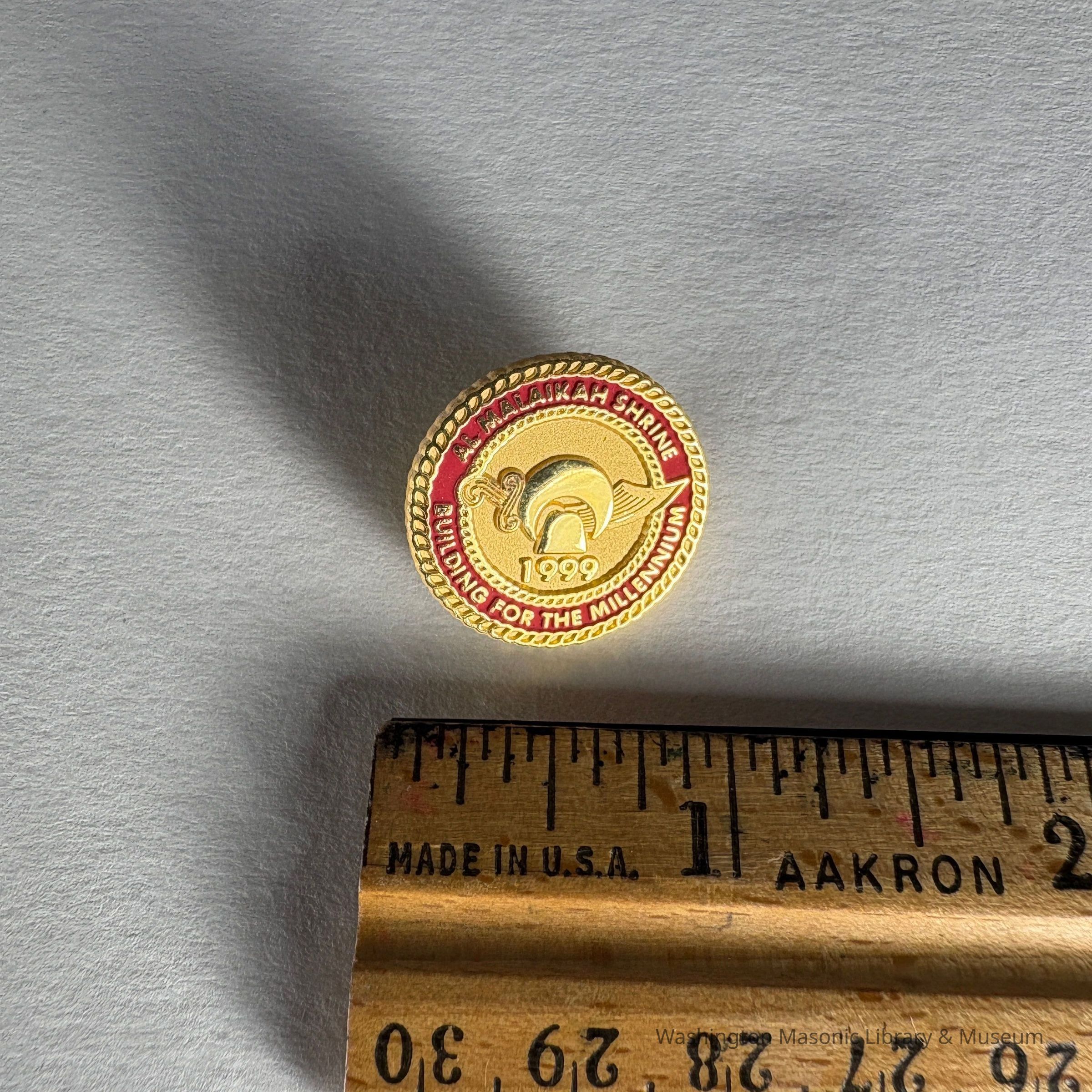 Pin: Circular. Gold with red detailing. "Al Malaikah Shrine/Building for the Millenium" Belonged to PGM James O. Wood (1999)Collection