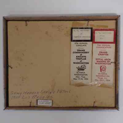 Photograph: Framed. 1950 Shrine Patrol, Los Angeles. 2 badges for "A.M. Anderson" on back.