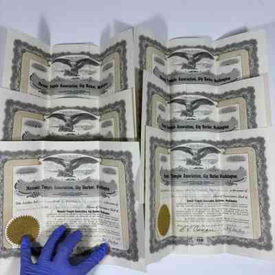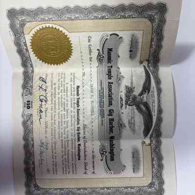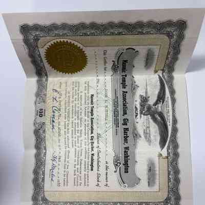 Two Certificates: 2 Masonic Temple Association, Gig Harbor, Washington Share Certificates issued to James H. Blundell by the Secretary of John Paul Jones Lodge No. 271.