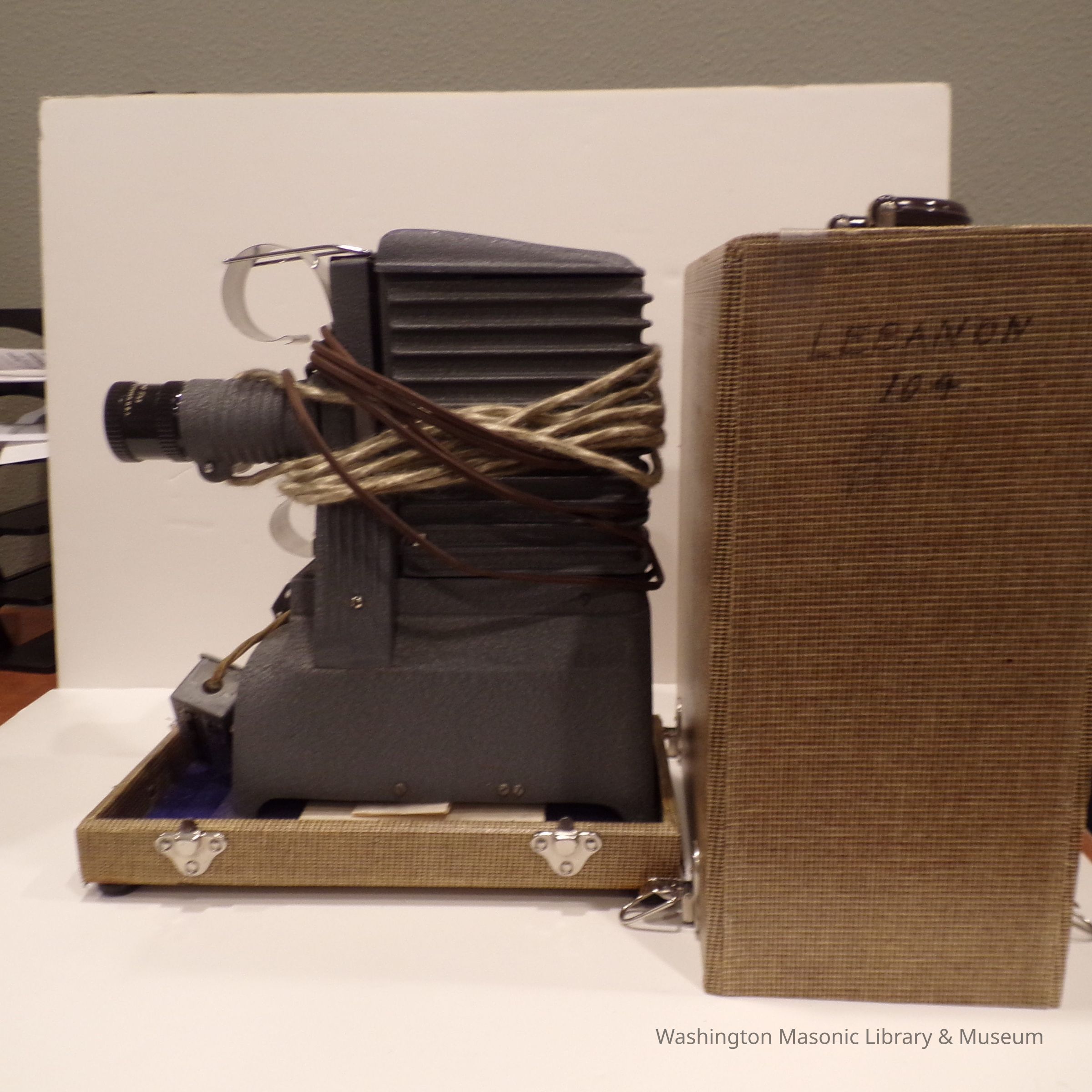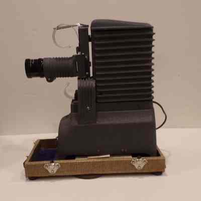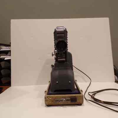 Projector: c. mid 20th century. In box with writing "Lebanon 104" With accompanying box, chord, and instructions. c. Mid 20th century. Found in the Royal A. Gove attic cleanout.