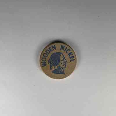 On Front Side: Bust of Indigenous man wearing a headress. "Wooden Nickel"