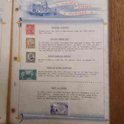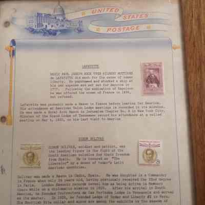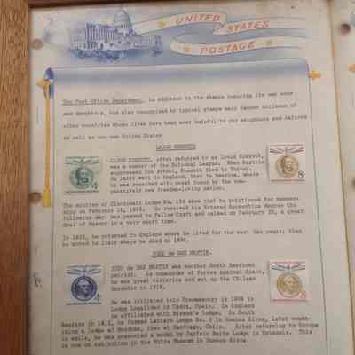 Framed Exhibit: 6 pages displaying stamps of famous masons. "Presented to Chehalis Lodge 28 by Dr. Arthur S. Cory, April 1959"Collection