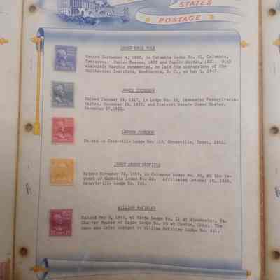 Framed Exhibit: 6 pages displaying stamps of famous masons. "Presented to Chehalis Lodge 28 by Dr. Arthur S. Cory, April 1959"Entry/Object ID