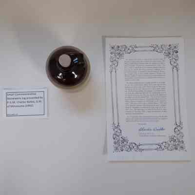 Jug: small commemorative stoneware jug presented by P.G.M. Charles Baltos, G.M. of Minnesota. Comes with signed paper letter and envelope. Perhaps presented to Charles Leslie, GM of WA 1992.
