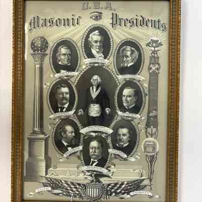 Poster: In gold painted wood frame. U.S.A. Masonic Presidents. Black and White poster of nine Presidents of the United States who were also Freemasons (c.1920)