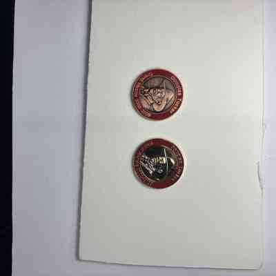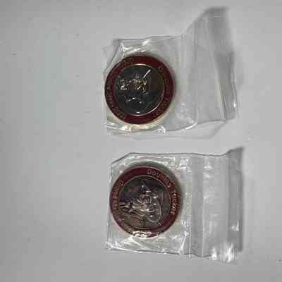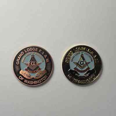 2 Coins: Two Past Grand Master Coins, MW Douglas Tucker (2008-2009). Depicts Tucker's bust on the front side. On the bakside is the square and compass with light blue circular background, and two open hands. "Pass it On."