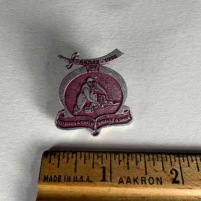 Pin: Silver with red accents. Scimitar, crescent, man helping a fallen child off the ground. "Akdar- 1998/Helping a Child Brings a Smile". Donated by PGM James O. Wood (1998)Collection