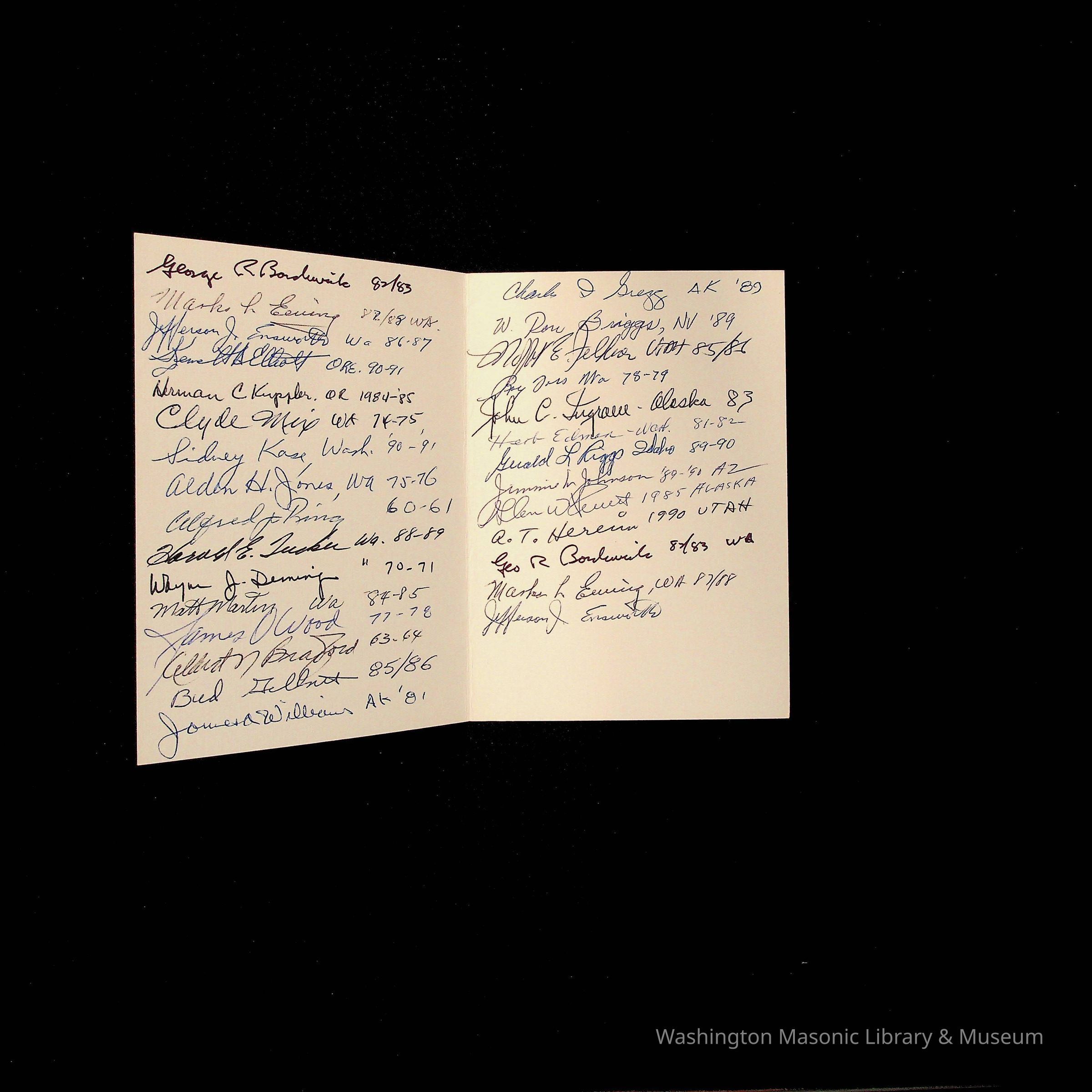 Pamphlet: The Induction Ceremony of the Past Grand Masters of Washington, 1990". Belonged to PGM George R. Bordewick (82/83) Signed by many Past GMs.Collection