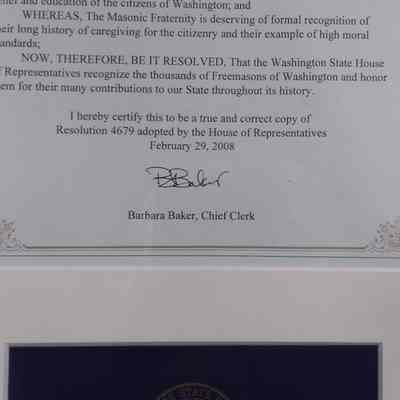 Proclamation: Framed. From the Washington State House of Representatives Resolution 4679 "recognizes the thousands of Freemasons of Washington and honr them for their many contributions to our State throughout its history." Signed by Barbara Baker, Chief Clerk.Collection