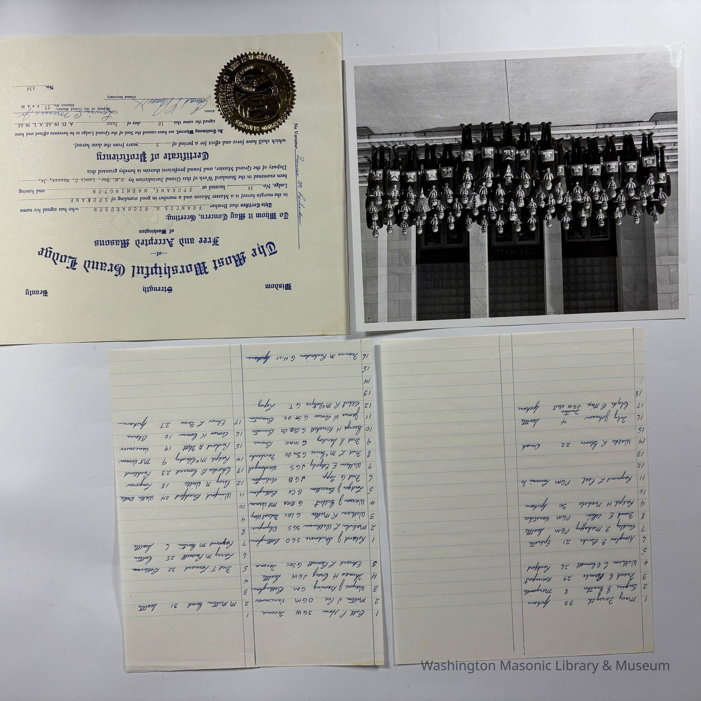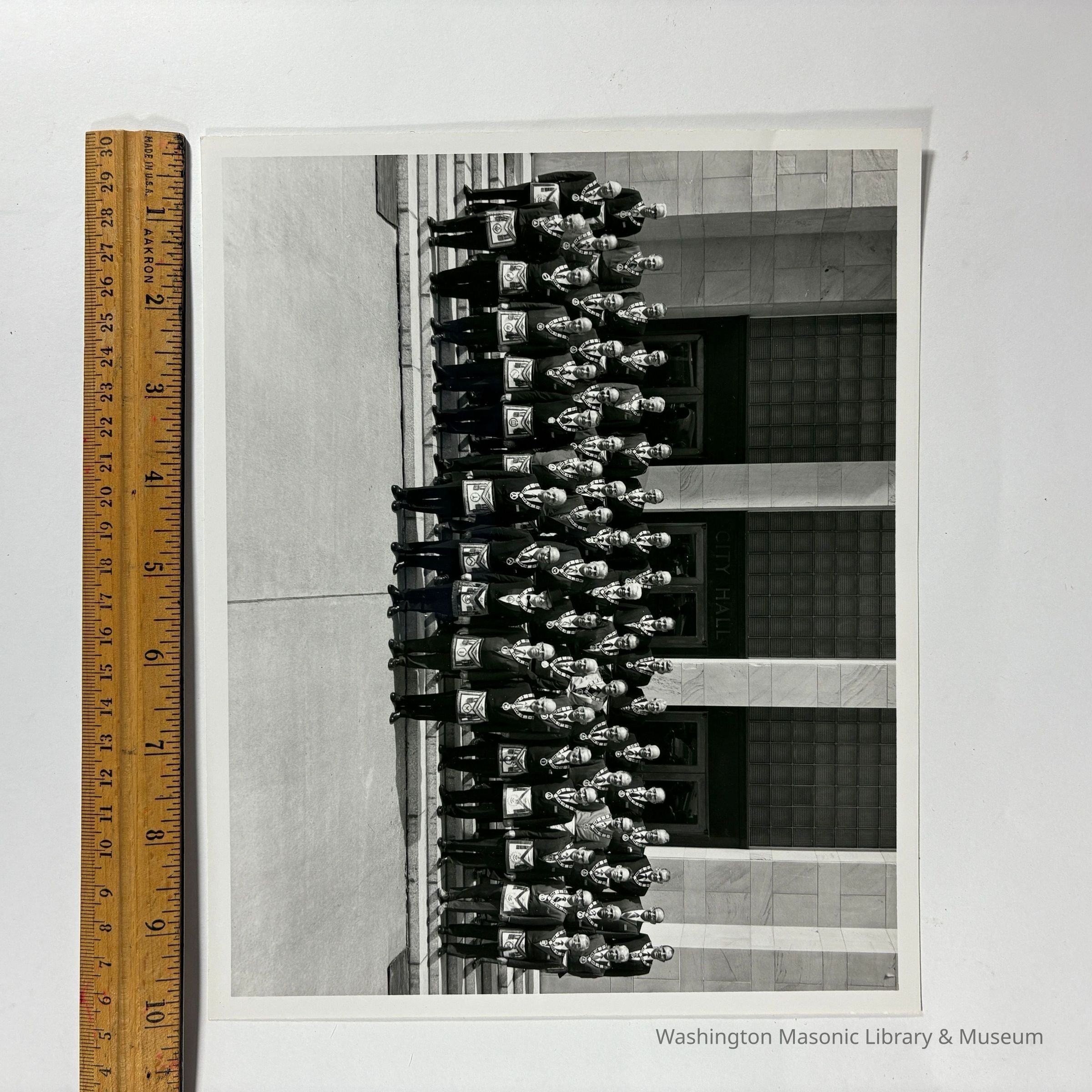 Photograph: Grand Lodge standing in front of Bellingham City Hall (c. 1971). Taken during the 114th Annual Communication. Likely belonged to Francis M. Richardson, Grand Historian that year.
