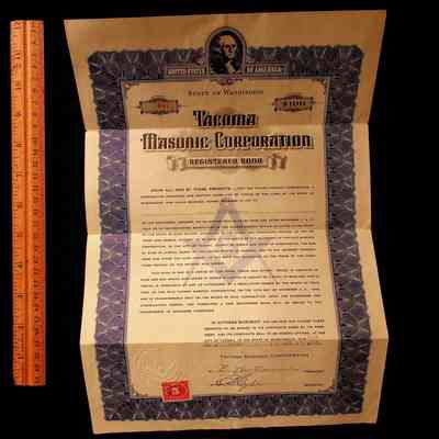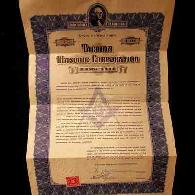 Bond: Registered Bond for 100 dollars from the Tacoma Masonic Corporation for H.P. Monk. Issued in 1923.Collection