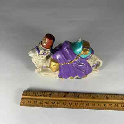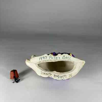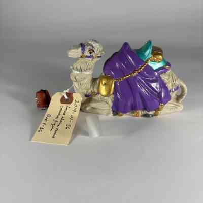Figurine: Camel. Painted white camel wearing blue, turquoise and gold decor. Wearing Fez. On the bottom reads: "1997 Pote's Ball/ R. Wayne Duke"