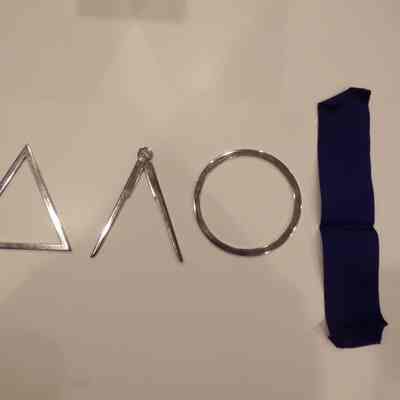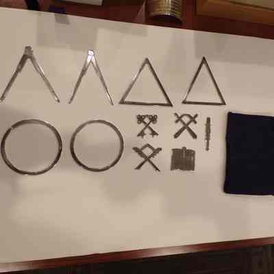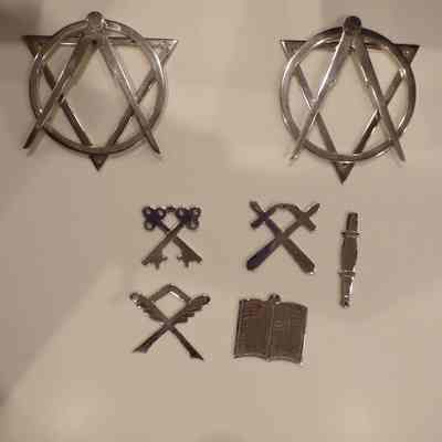 14 Metal Symbols: including blue bag and ribbon. Order of Desoms. Meanings and use unknown.