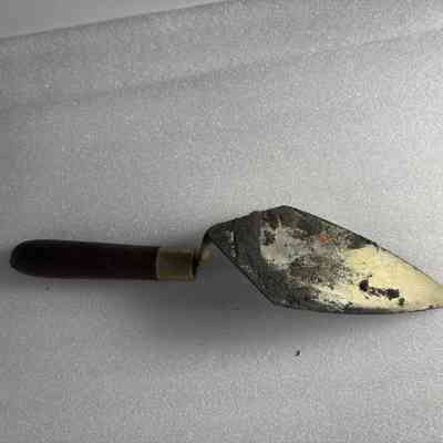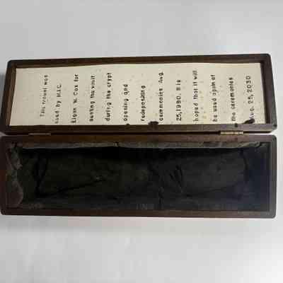 Trowel and Box: Trowel used by M.I.C. Elgan W. Cox for sealing the vault during the crypt opening and redepositing ceremonies Aug. 25, 1980. It is hoped that it will be used again at the ceremonies Aug. 25, 2030.