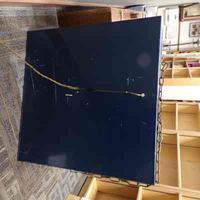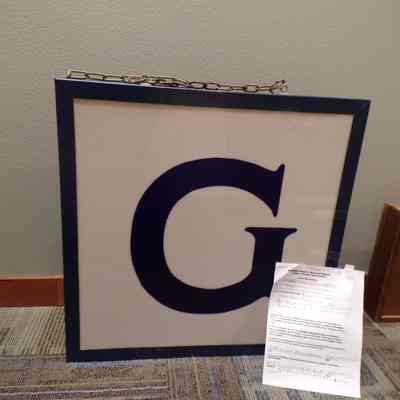 Sign: Large, blue and white sign for the east side of a lodge. "G". Electric plug in.Collection